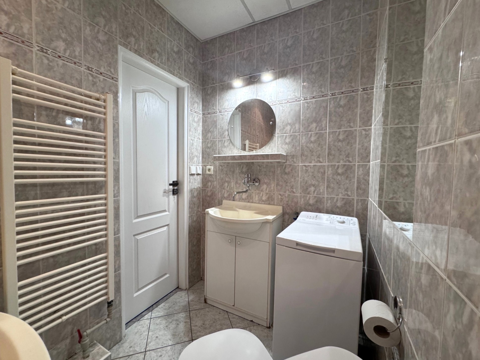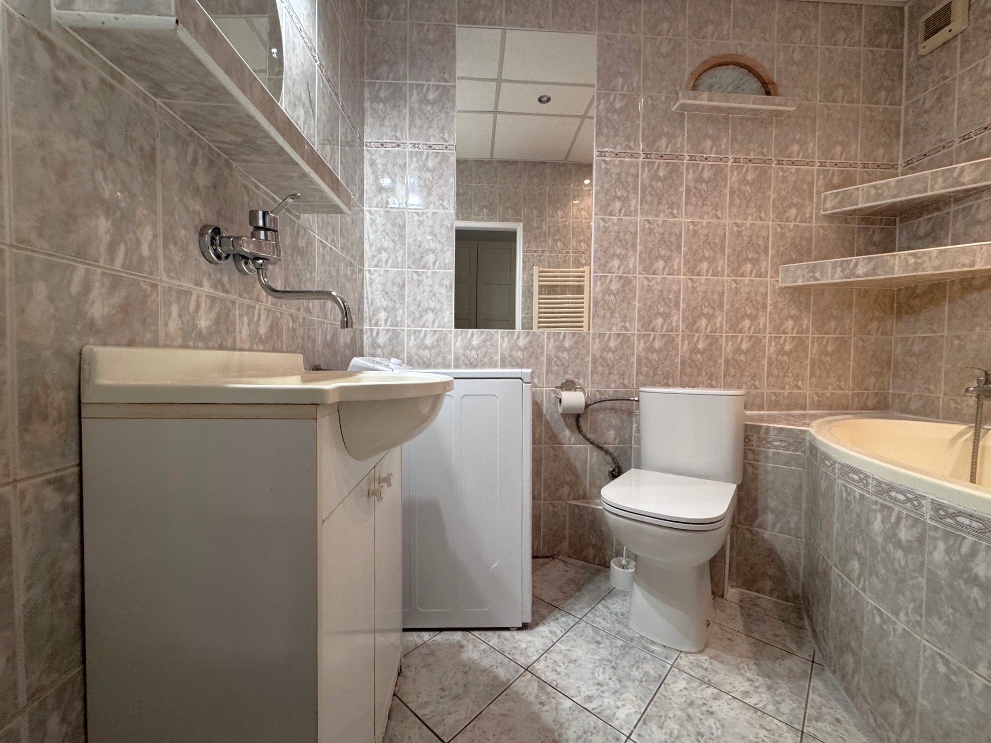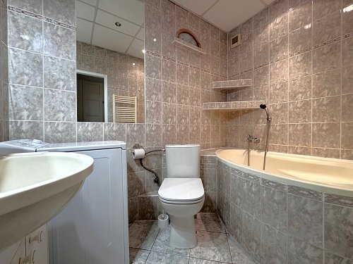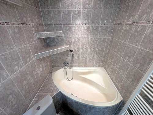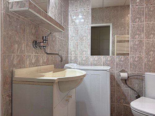 V kúpeľni sa nachádza vaňa s novou sanitou a keramickým obkladom, súčasťou vybavenia je aj práčka.