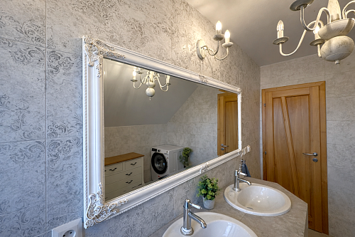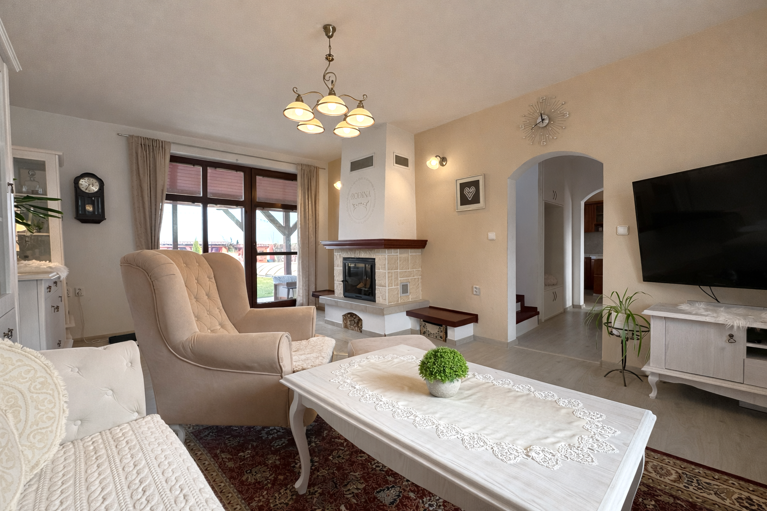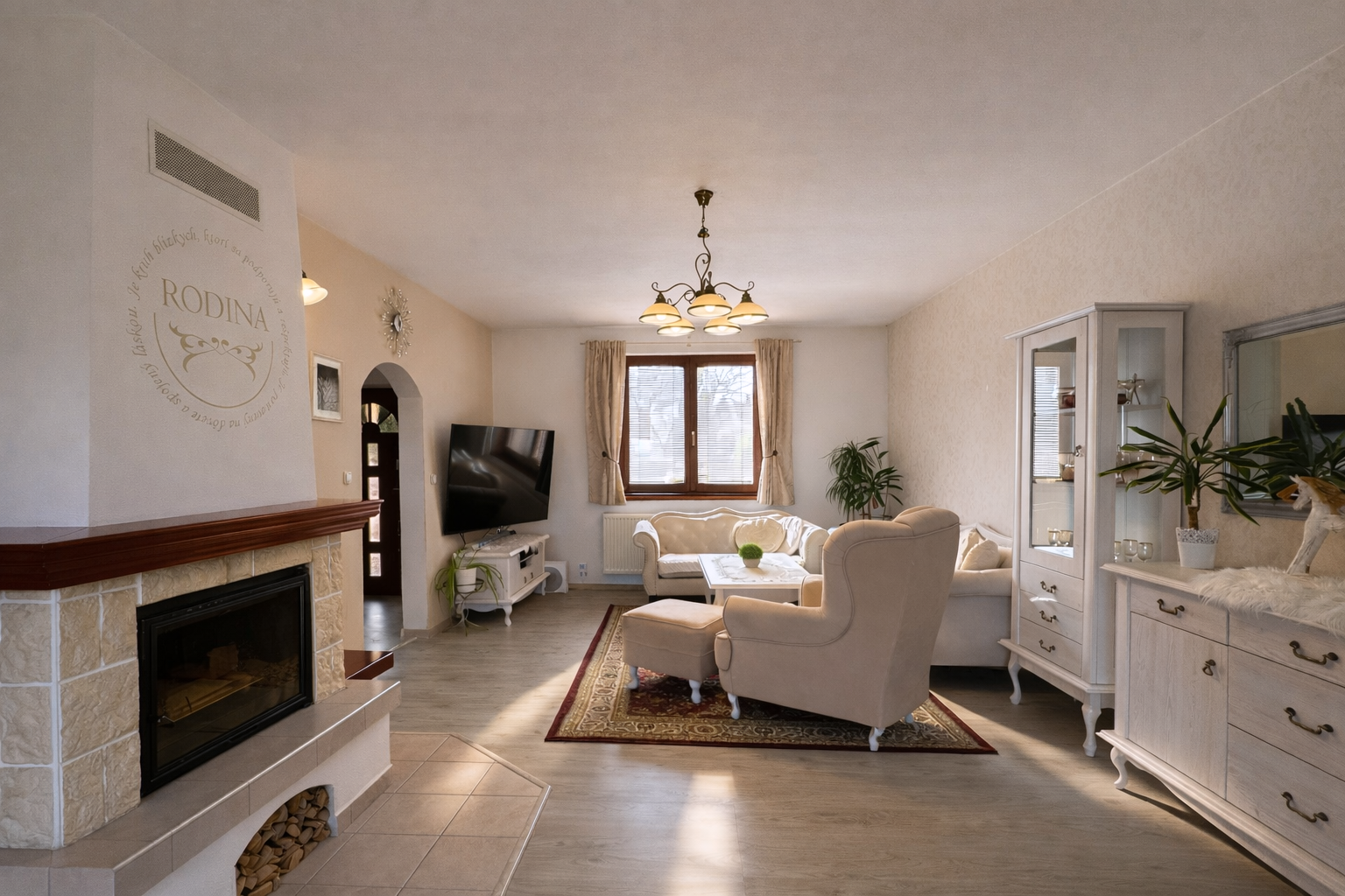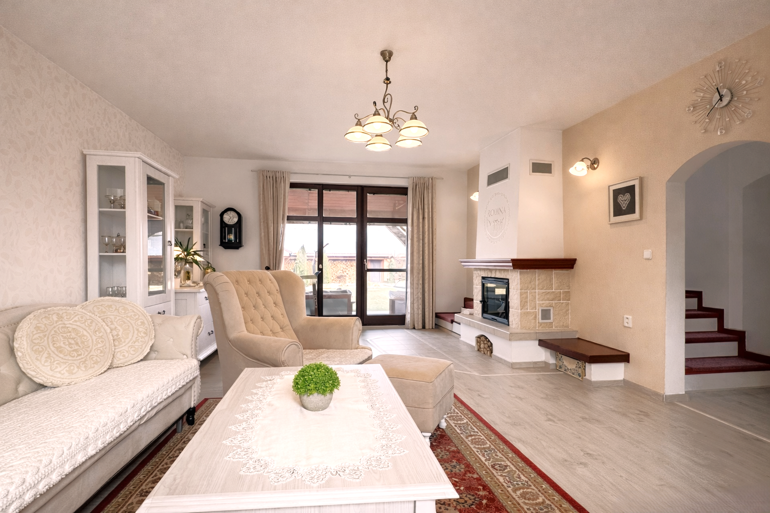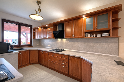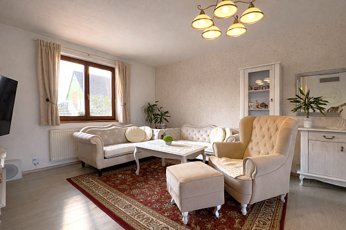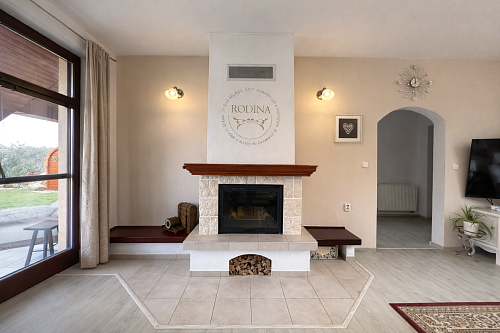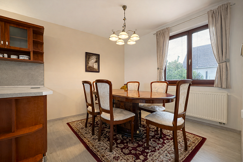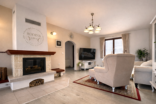 Dominantou interiéru je štýlový nábytok s nádychom baroka, najmä na prízemí, kde kuchyňa a obývacia izba vytvárajú elegantný a reprezentatívny priestor. Srdcom domu je obývačka s centrálnym krbom a rozvodmi tepla do celého domu, ktorá pôsobí teplo, harmonicky a veľkoryso. Kuchyňa je vybavená kvalitnými spotrebičmi, so špajzou na dosah ruky, a spolu s technickým zázemím, samostatnou toaletou a sprchovým kútom tvorí dokonale funkčný celok.