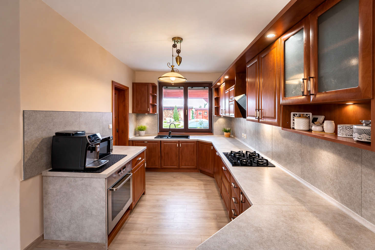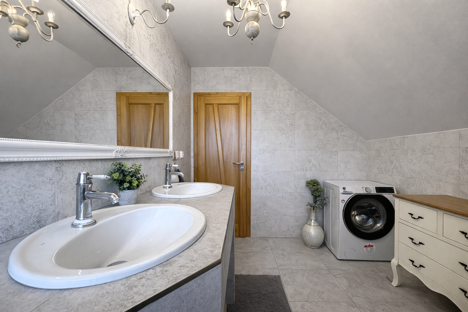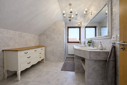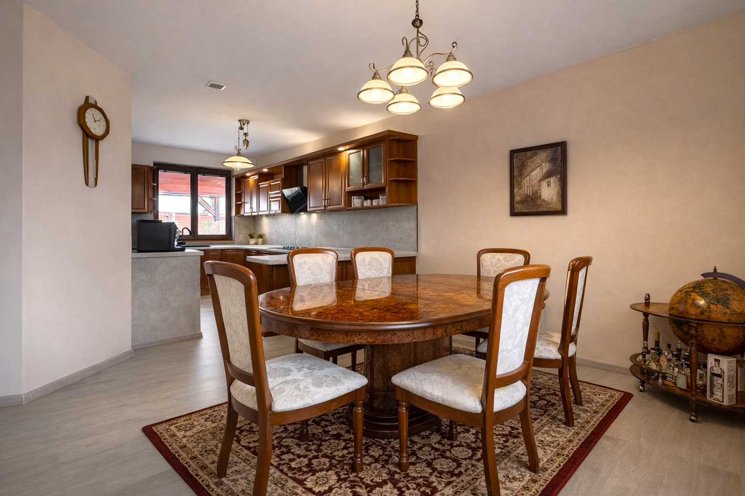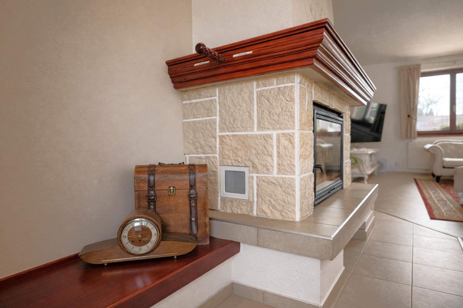 Dominantou interiéru je štýlový nábytok s nádychom baroka, najmä na prízemí, kde kuchyňa a obývacia izba vytvárajú elegantný a reprezentatívny priestor. Srdcom domu je obývačka s centrálnym krbom a rozvodmi tepla do celého domu, ktorá pôsobí teplo, harmonicky a veľkoryso. Kuchyňa je vybavená kvalitnými spotrebičmi, so špajzou na dosah ruky, a spolu s technickým zázemím, samostatnou toaletou a sprchovým kútom tvorí dokonale funkčný celok.