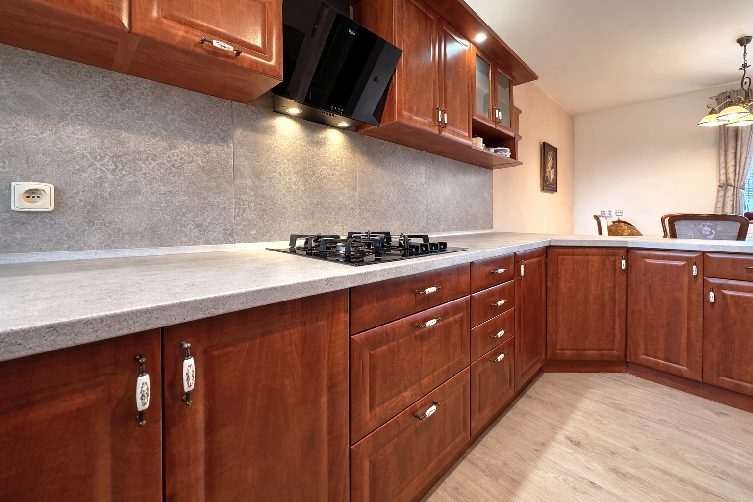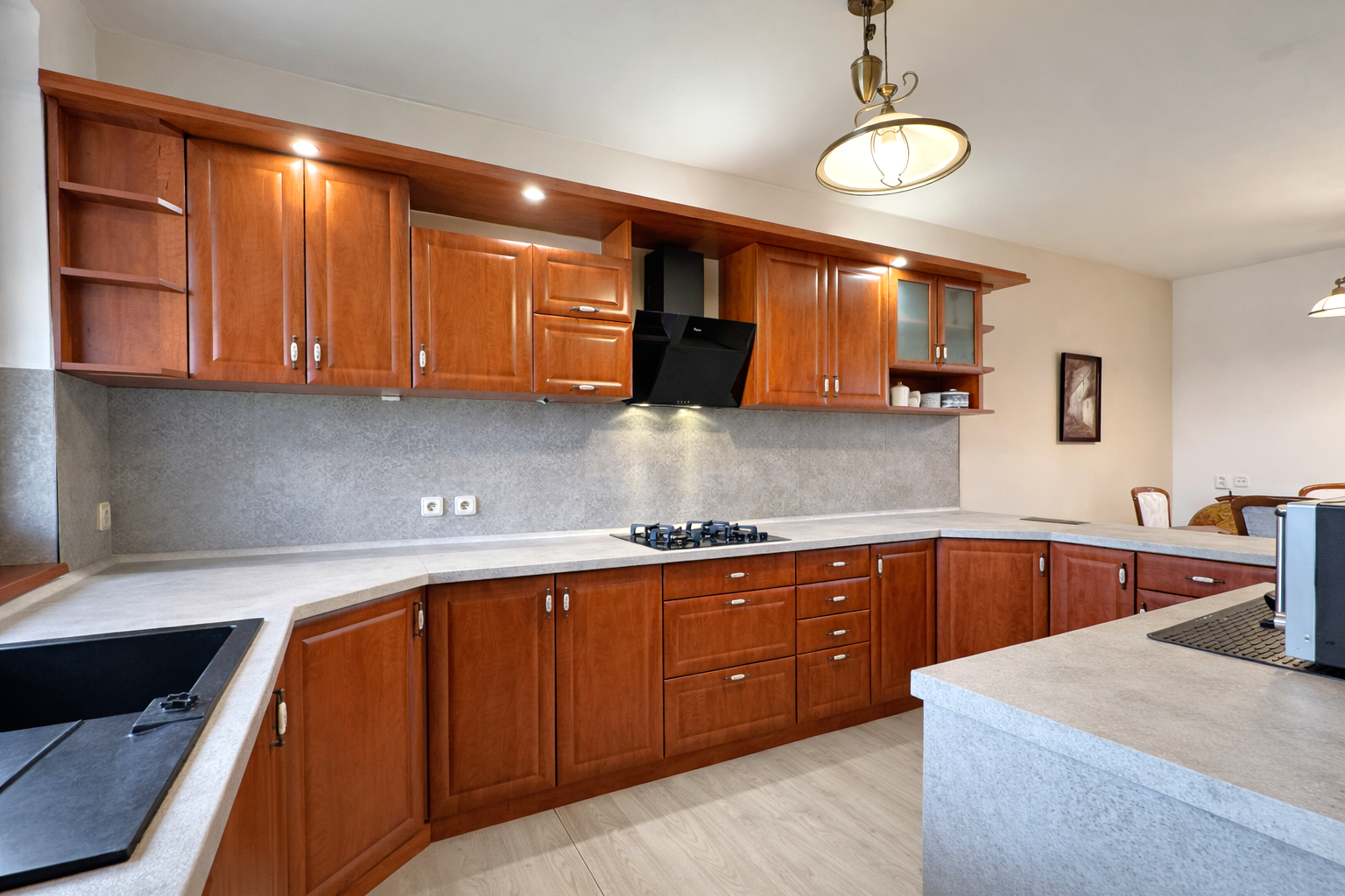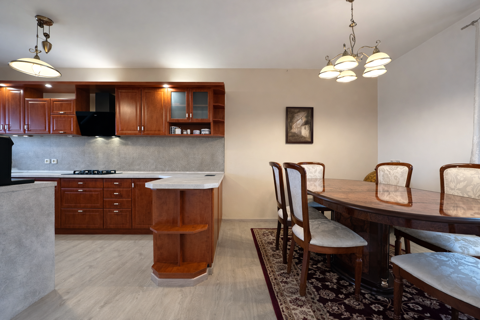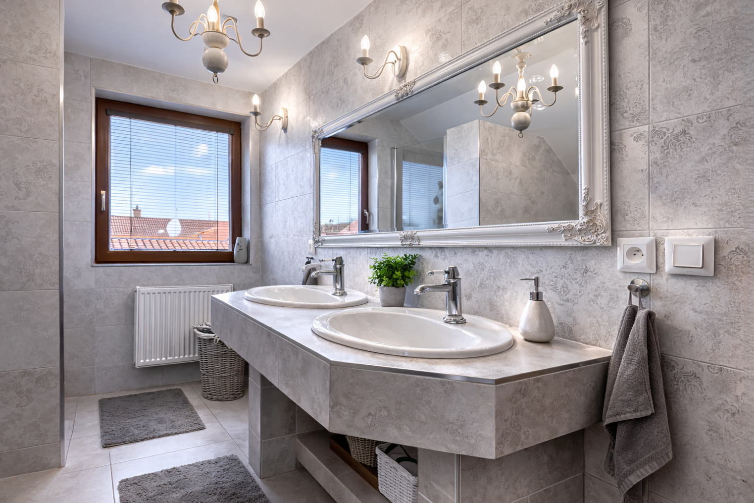 Dominantou interiéru je štýlový nábytok s nádychom baroka, najmä na prízemí, kde kuchyňa a obývacia izba vytvárajú elegantný a reprezentatívny priestor. Srdcom domu je obývačka s centrálnym krbom a rozvodmi tepla do celého domu, ktorá pôsobí teplo, harmonicky a veľkoryso. Kuchyňa je vybavená kvalitnými spotrebičmi, so špajzou na dosah ruky, a spolu s technickým zázemím, samostatnou toaletou a sprchovým kútom tvorí dokonale funkčný celok.