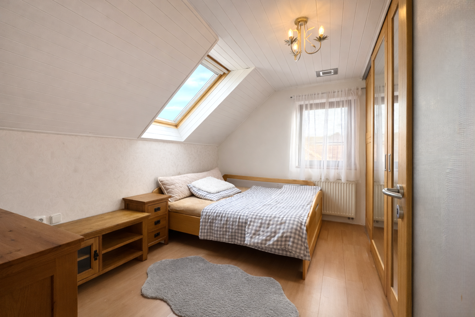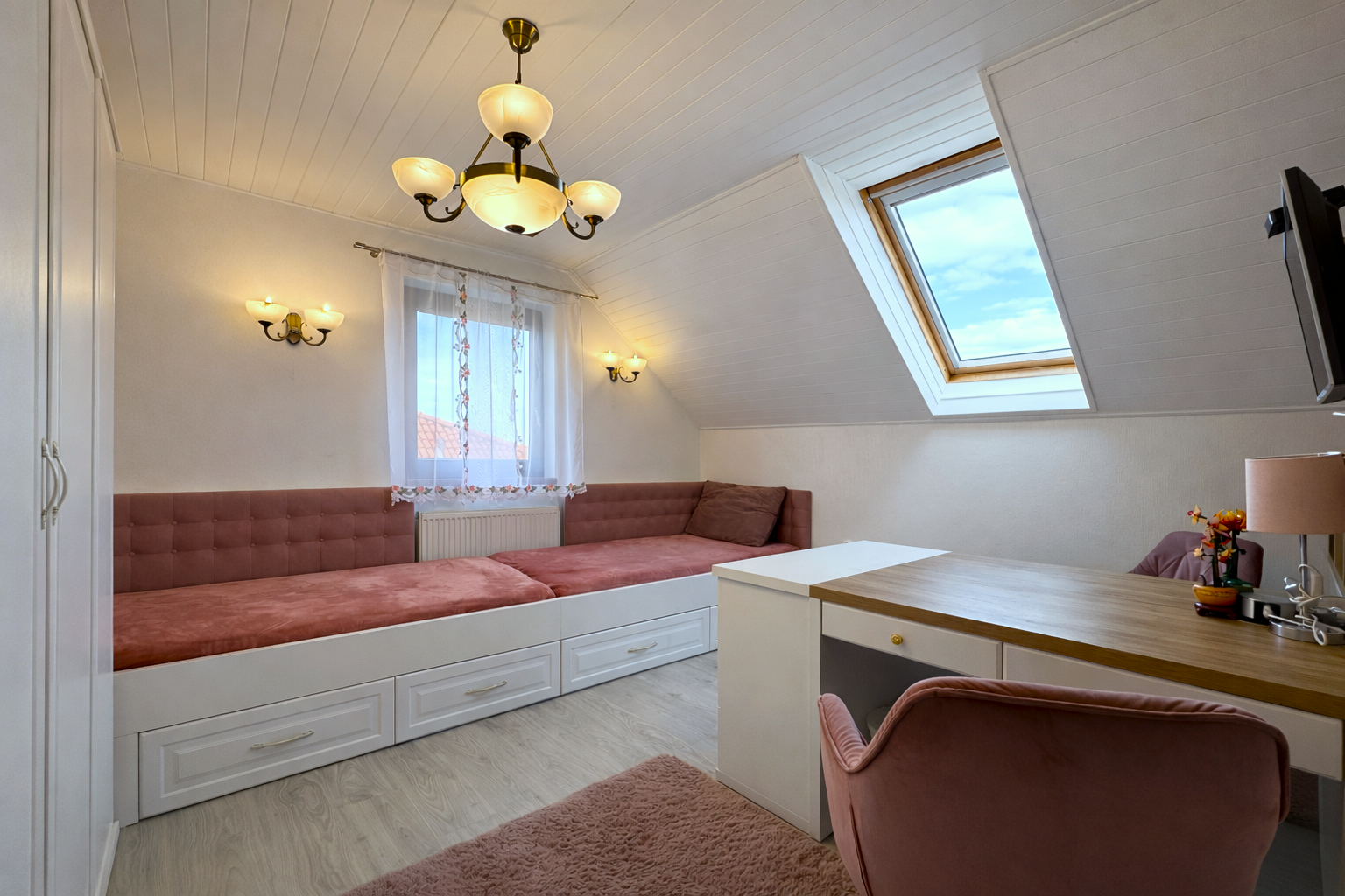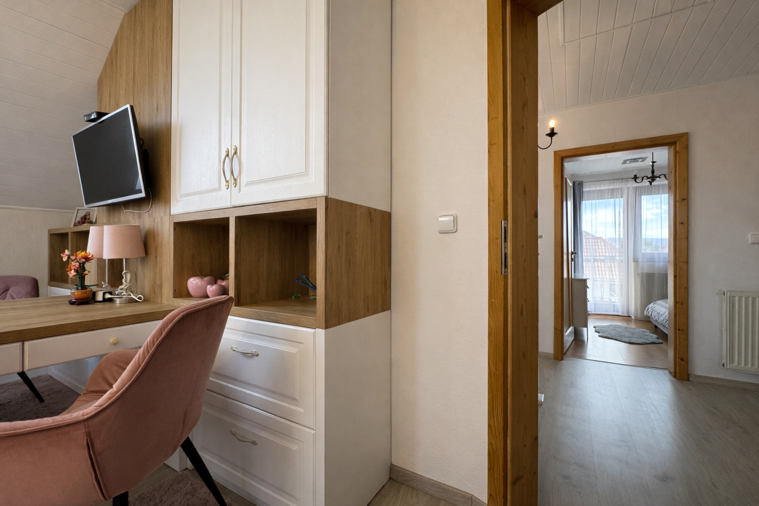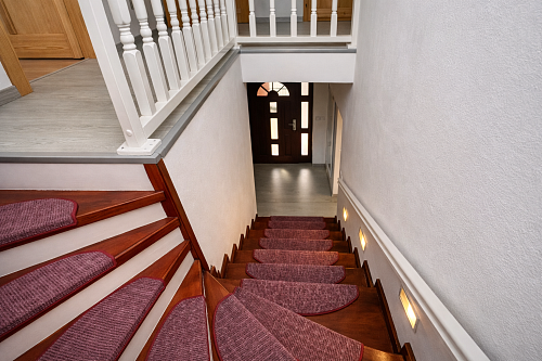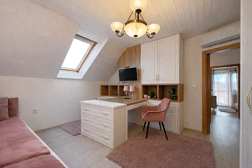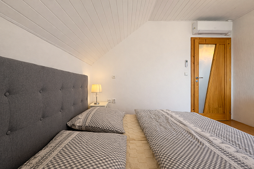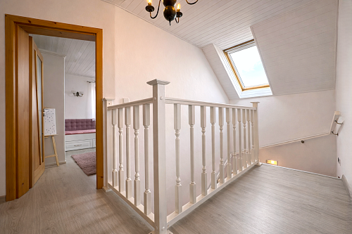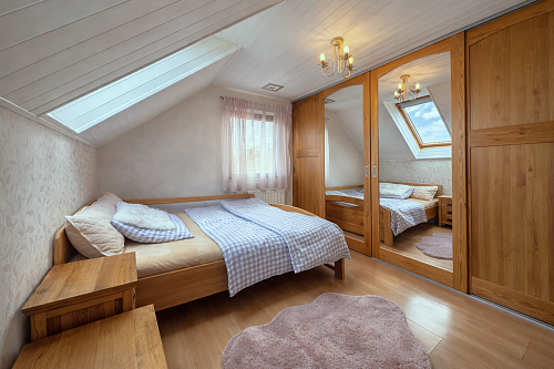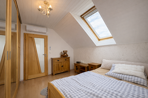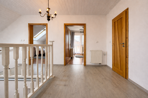Na poschodí sa nachádzajú tri samostatné nepriechodné izby, pričom spálňa disponuje balkónom a dve detské izby, všetky sú zariadené vstavaným nábytkom na mieru. Taktiež je tu hlavná kúpeľňa so sprchovým kútom a podlahovým kúrením, samostatná toaleta a šatník pre komfort celej rodiny. Povala je pochôdzna po celej ploche strechy a poskytuje dostatok úložného priestoru.