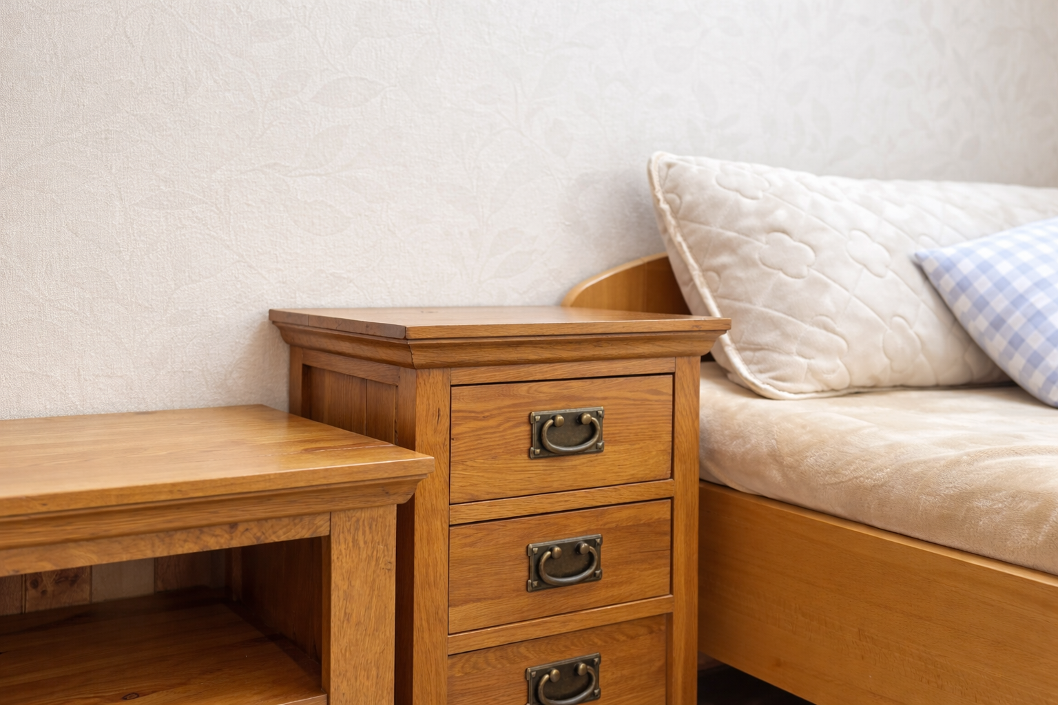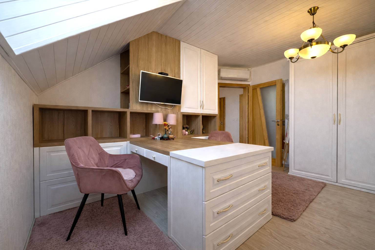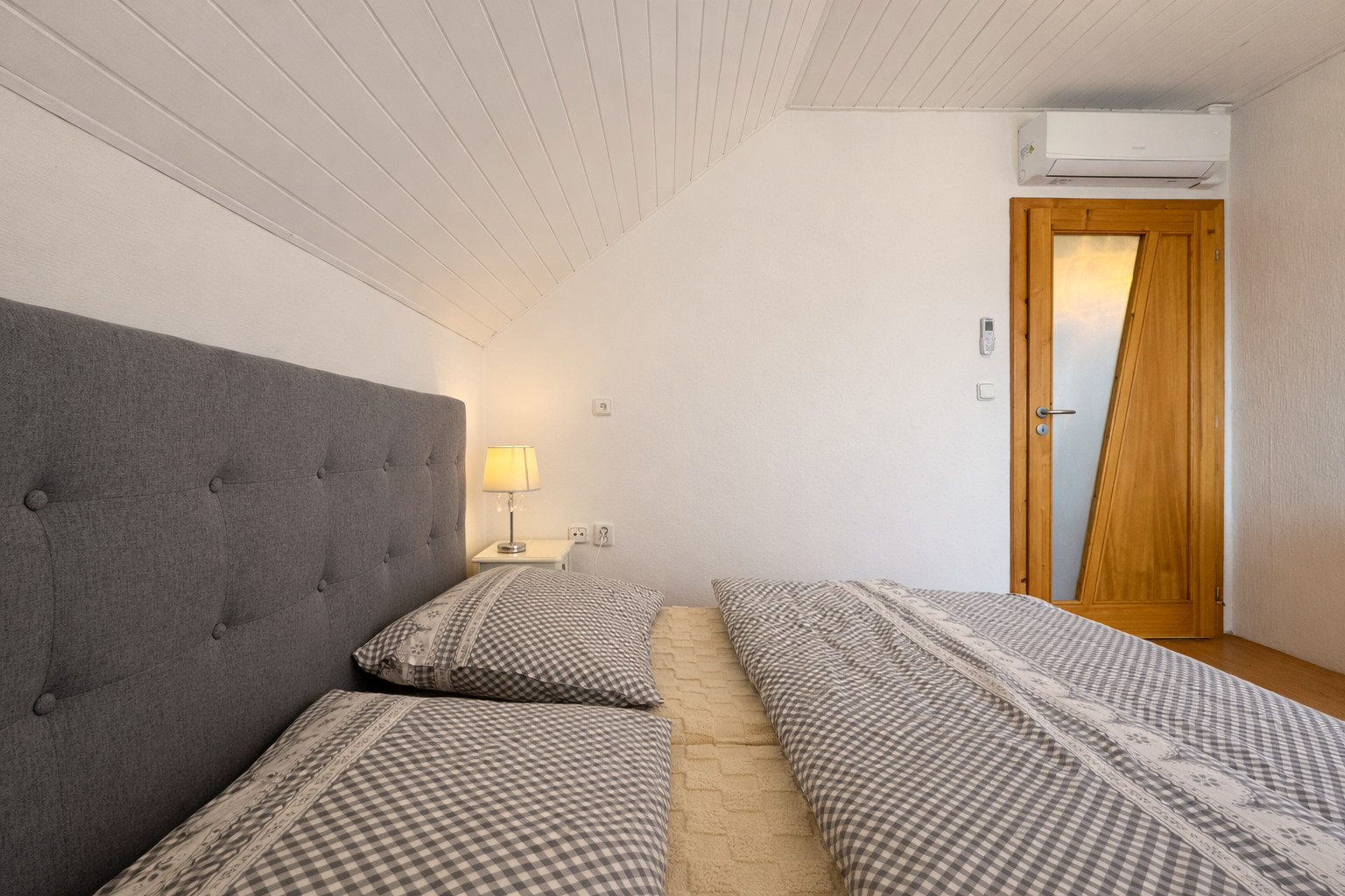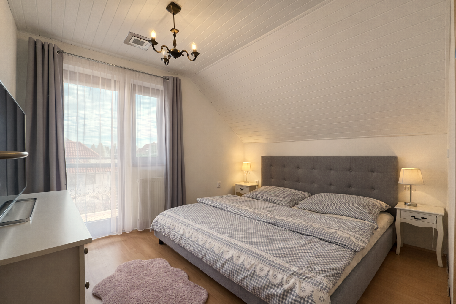 Na poschodí sa nachádzajú tri samostatné nepriechodné izby, pričom spálňa disponuje balkónom a dve detské izby, všetky sú zariadené vstavaným nábytkom na mieru. Taktiež je tu hlavná kúpeľňa so sprchovým kútom a podlahovým kúrením, samostatná toaleta a šatník pre komfort celej rodiny. Povala je pochôdzna po celej ploche strechy a poskytuje dostatok úložného priestoru.