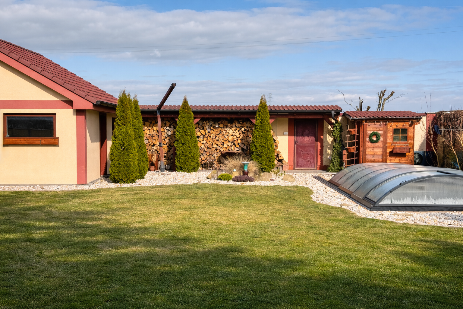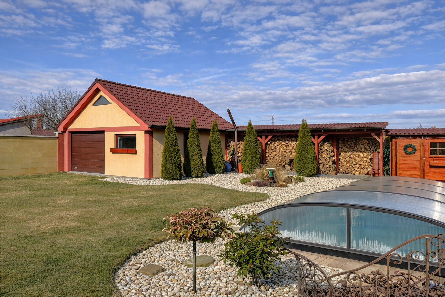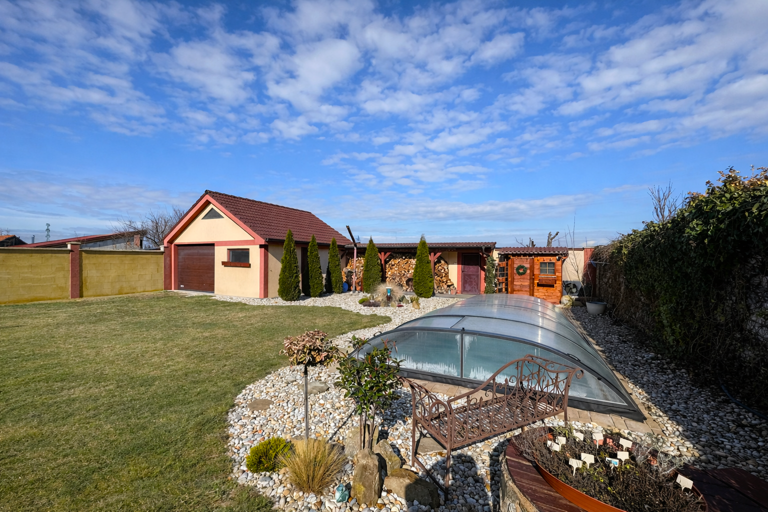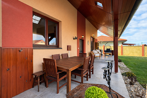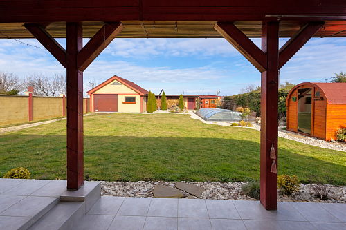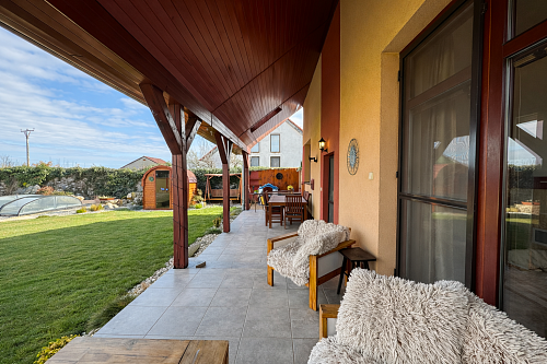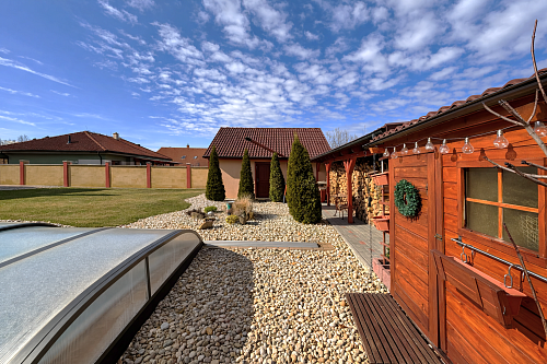 Exteriér je doslova záhradou ako z časopisu. Bazén Mountfield CORAL – PERSEUS premium so zastrešením, vyhrievaním a riadením chémie cez PC a UV sondu, bol odborne osadený v roku 2023. V roku 2024 pribudla sauna so 12 kW kachľami a jazierko s vodopádom, čím vznikla dokonalá relaxačná zóna. Nechýba vírivka, 30 m² zastrešená terasa, krbovisko pod čerešňou ani detské ihrisko.
