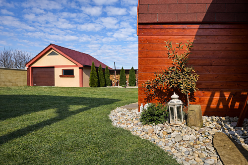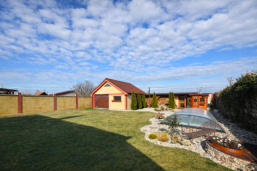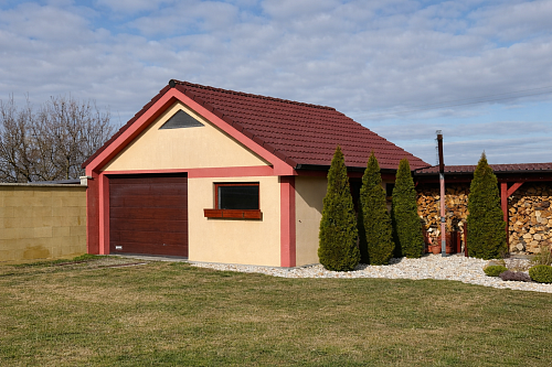 Súčasťou pozemku je multifunkčná garáž so zastavanou plochou 41 m², s elektrickou bránou na diaľkové ovládanie, bočným vstupom, kde je kuchynská linkou a úložným priestorom aj na povale. Budova o výmere 21 m2 je využívaná najmä v lete ako hosťovská so samostatným vstupom z dvora, vykurovanie je zabezpečené klimatizáciou. Taktiež technické zázemie bazéna je šikovne ukryté vo vlastnom domčeku.