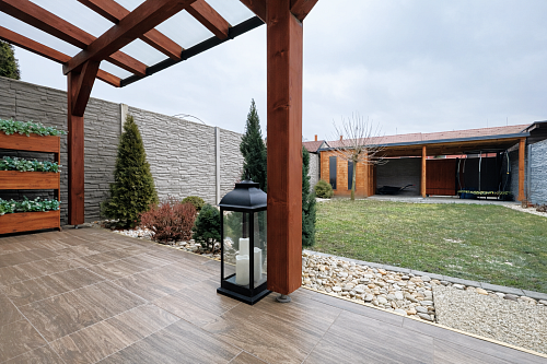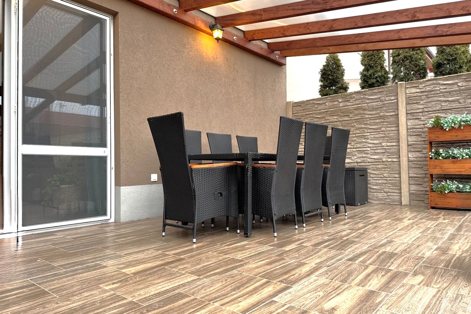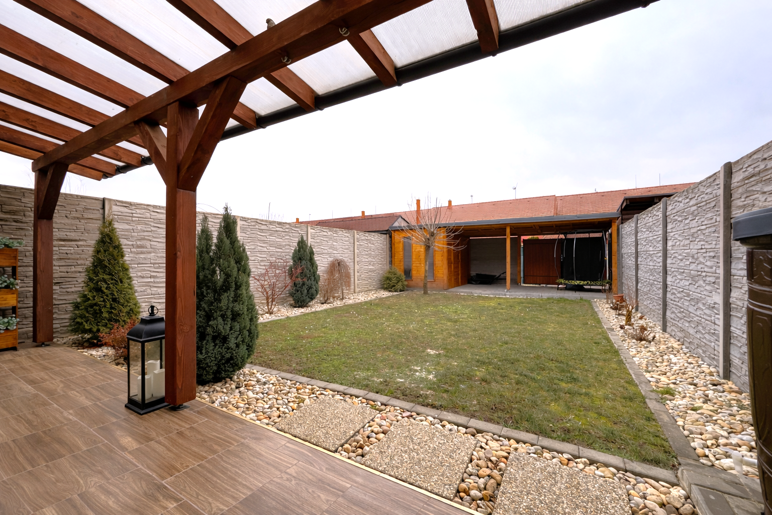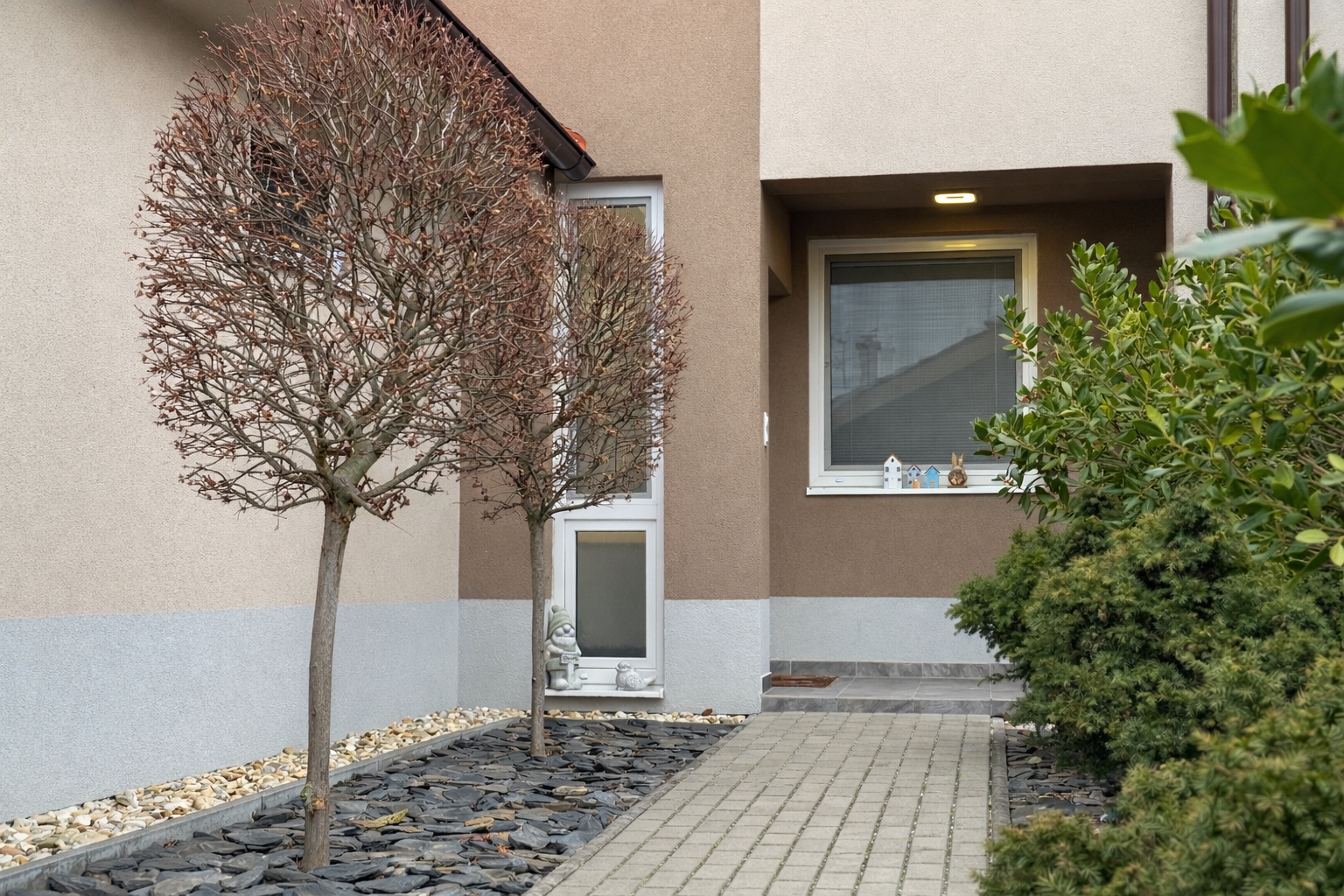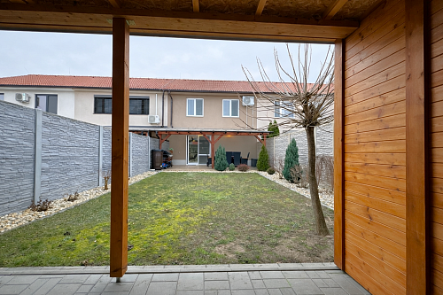 Dom je súčasťou radovej zástavby, nie je krajný a má veľkú výhodu v podobe garáže, ktorá je priamo prepojená s interiérom domu. Záhradu síce nenájdete, no o príjemný exteriér určite neprídete – k dispozícii je pekná terasa s posedením a útulný dvor, do ktorého sa vychádza priamo z obývačky cez veľké presklené terasové dvere. Na pozemok je navyše vstup aj z druhej strany, čo zvyšuje komfort a praktickosť bývania.