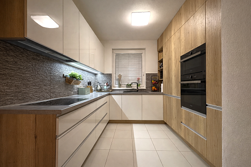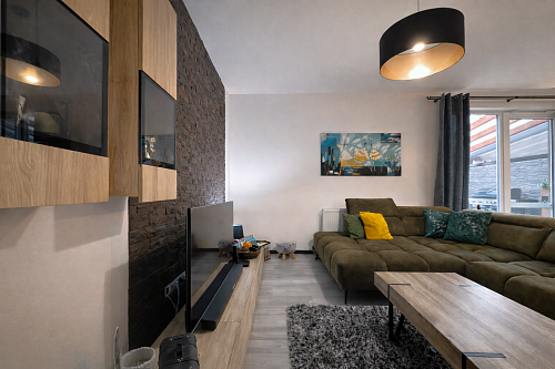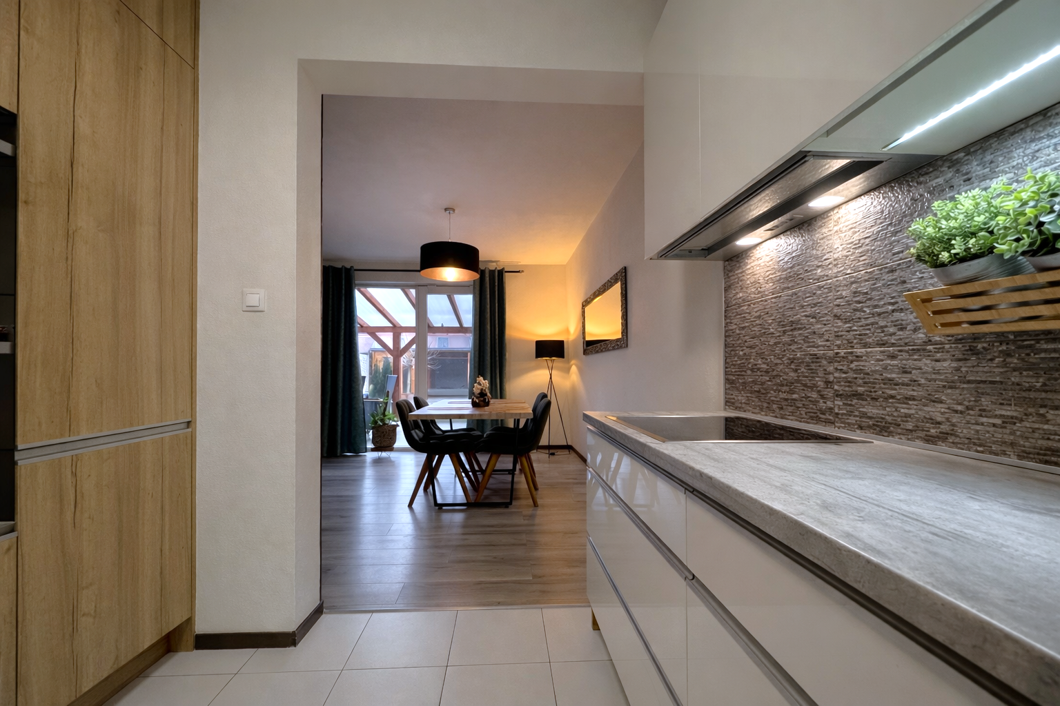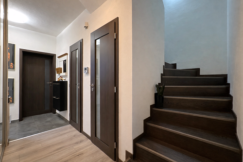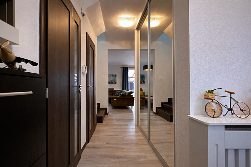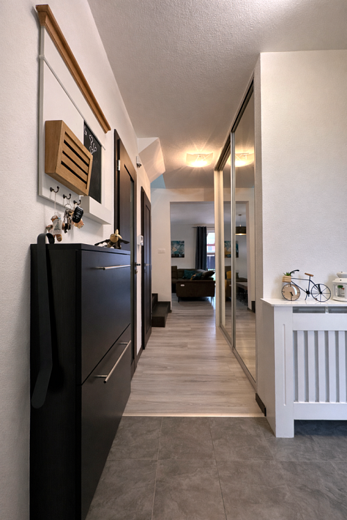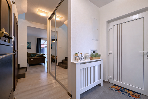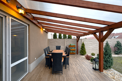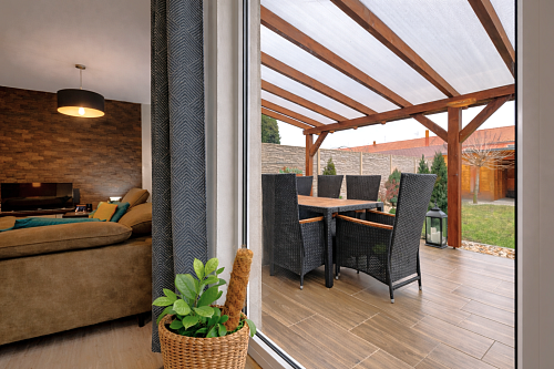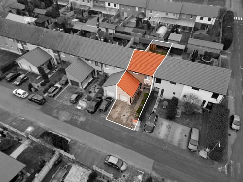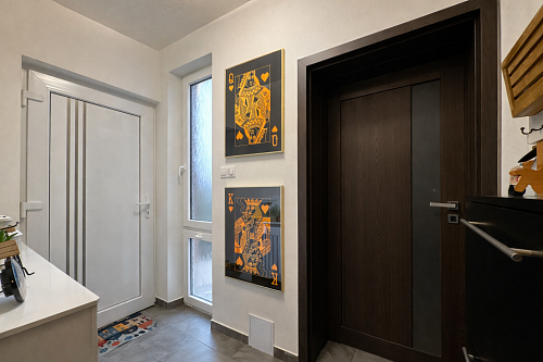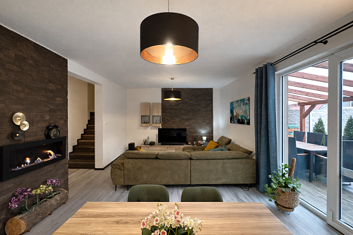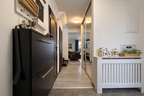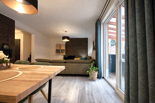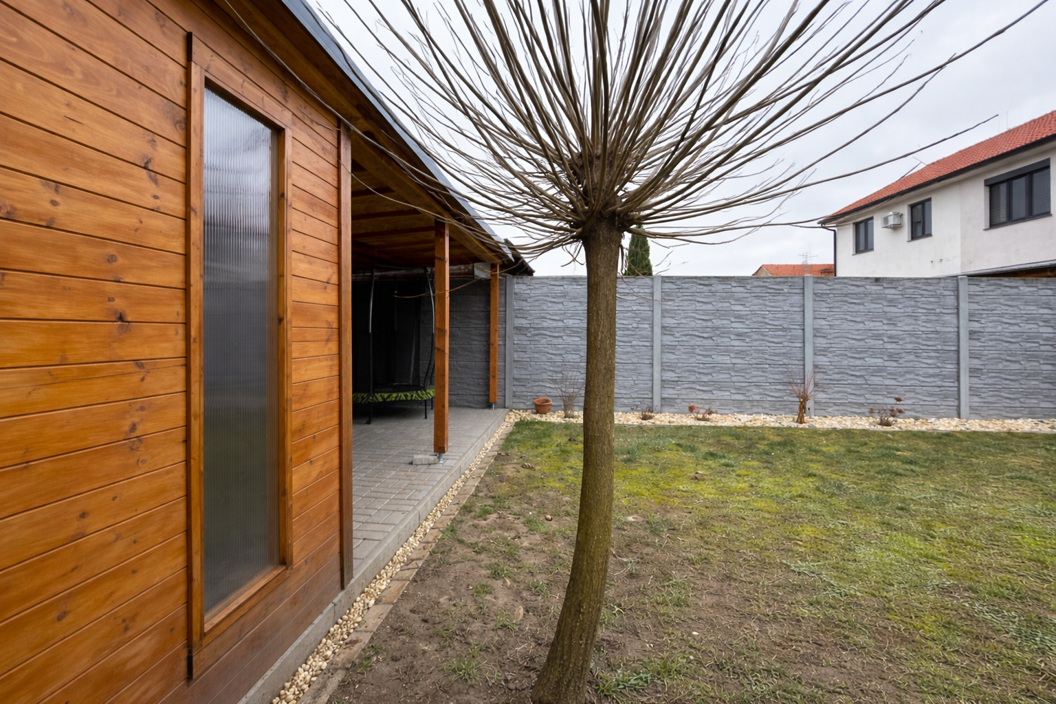 Dom je súčasťou radovej zástavby, nie je krajný a má veľkú výhodu v podobe garáže, ktorá je priamo prepojená s interiérom domu. Záhradu síce nenájdete, no o príjemný exteriér určite neprídete – k dispozícii je pekná terasa s posedením a útulný dvor, do ktorého sa vychádza priamo z obývačky cez veľké presklené terasové dvere. Na pozemok je navyše vstup aj z druhej strany, čo zvyšuje komfort a praktickosť bývania.