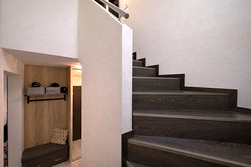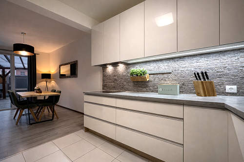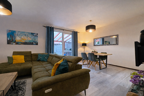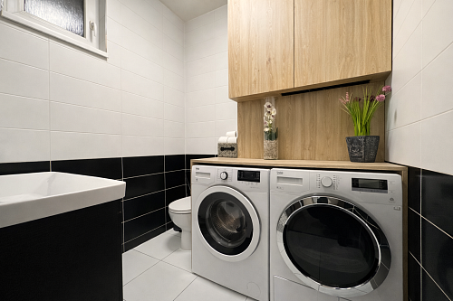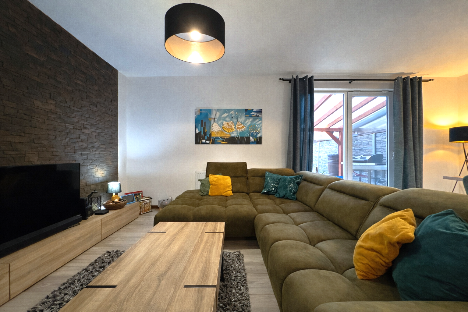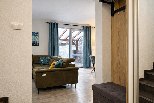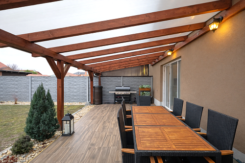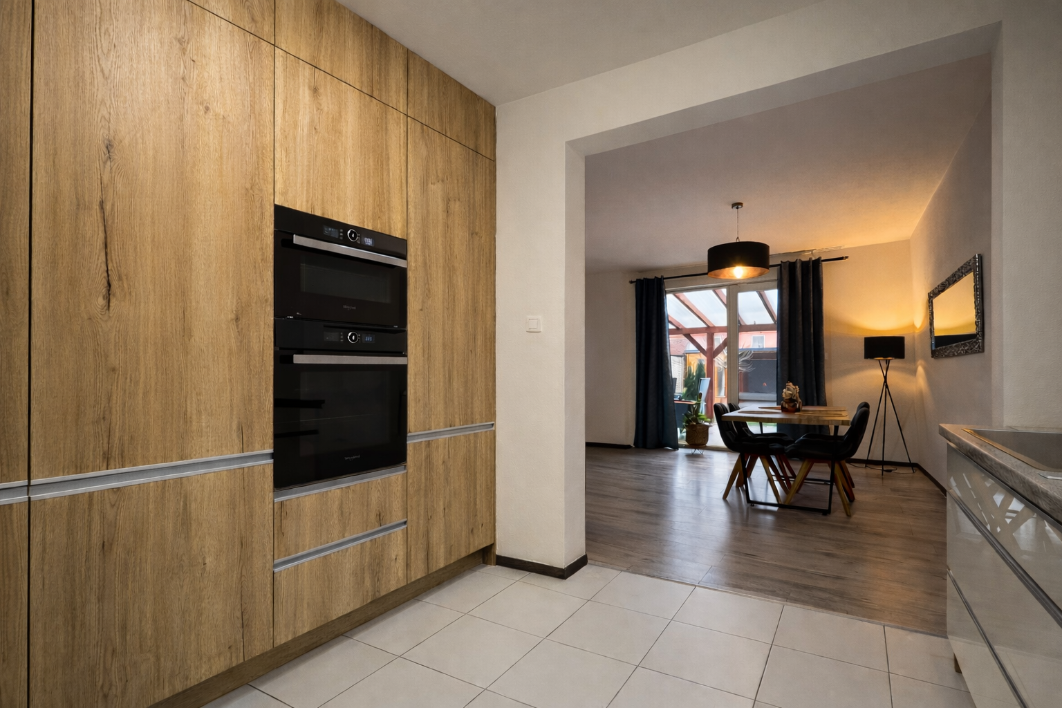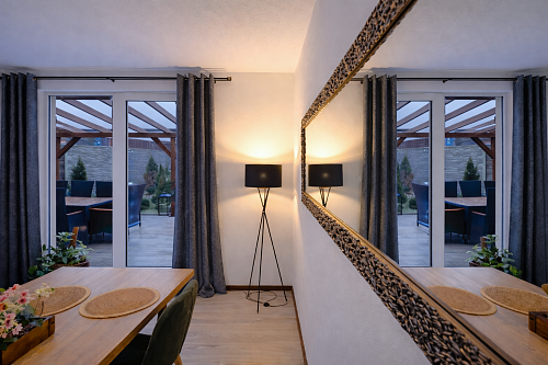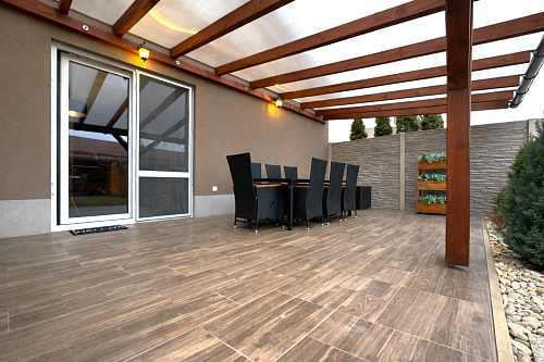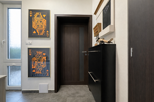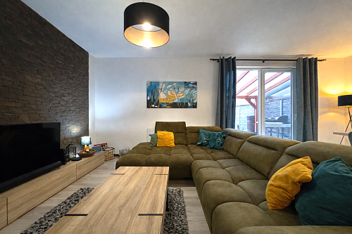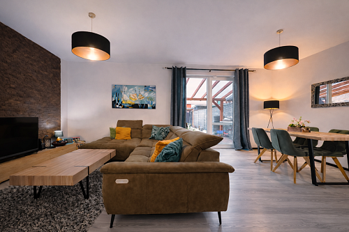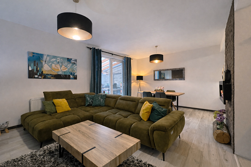 Dom je súčasťou radovej zástavby, nie je krajný a má veľkú výhodu v podobe garáže, ktorá je priamo prepojená s interiérom domu. Záhradu síce nenájdete, no o príjemný exteriér určite neprídete – k dispozícii je pekná terasa s posedením a útulný dvor, do ktorého sa vychádza priamo z obývačky cez veľké presklené terasové dvere. Na pozemok je navyše vstup aj z druhej strany, čo zvyšuje komfort a praktickosť bývania.