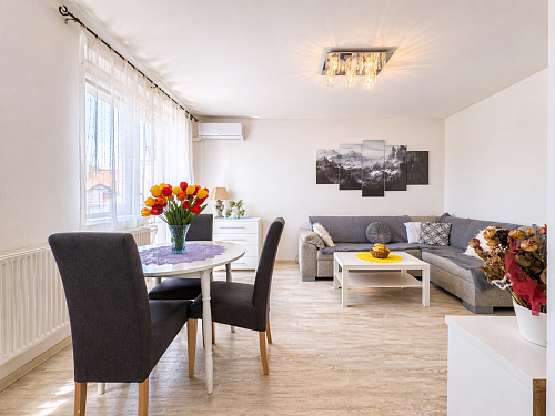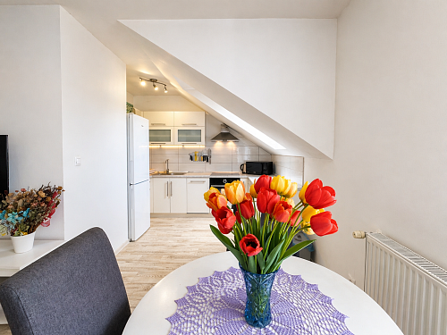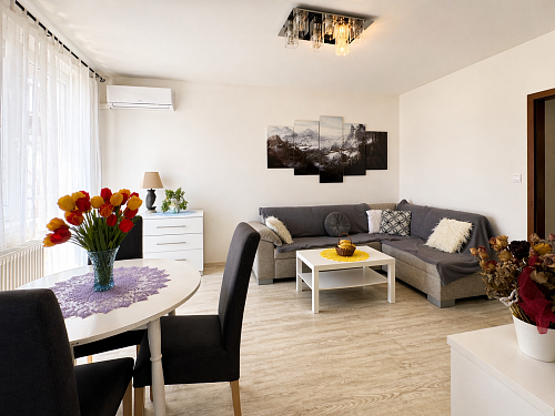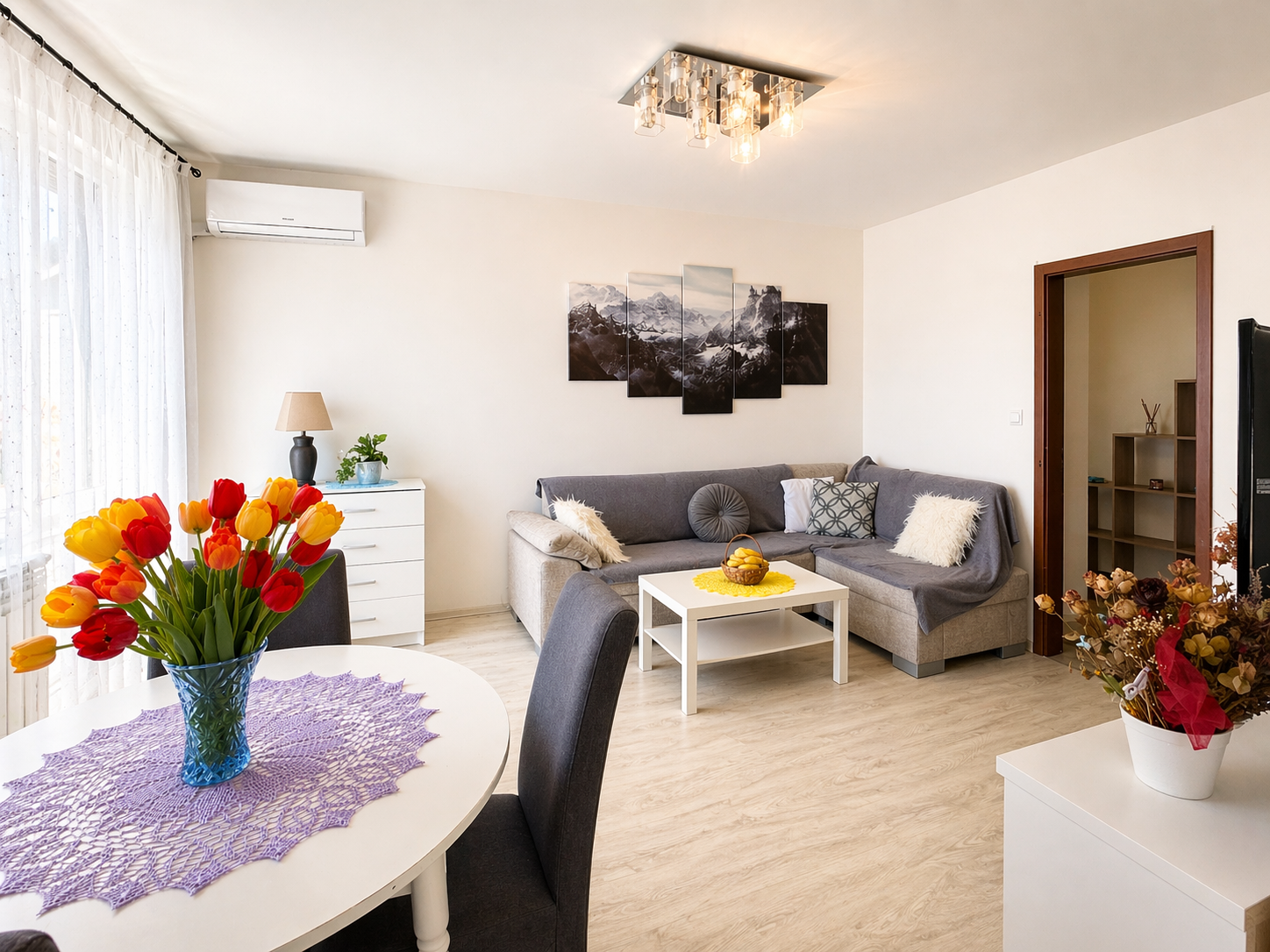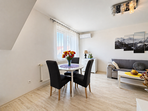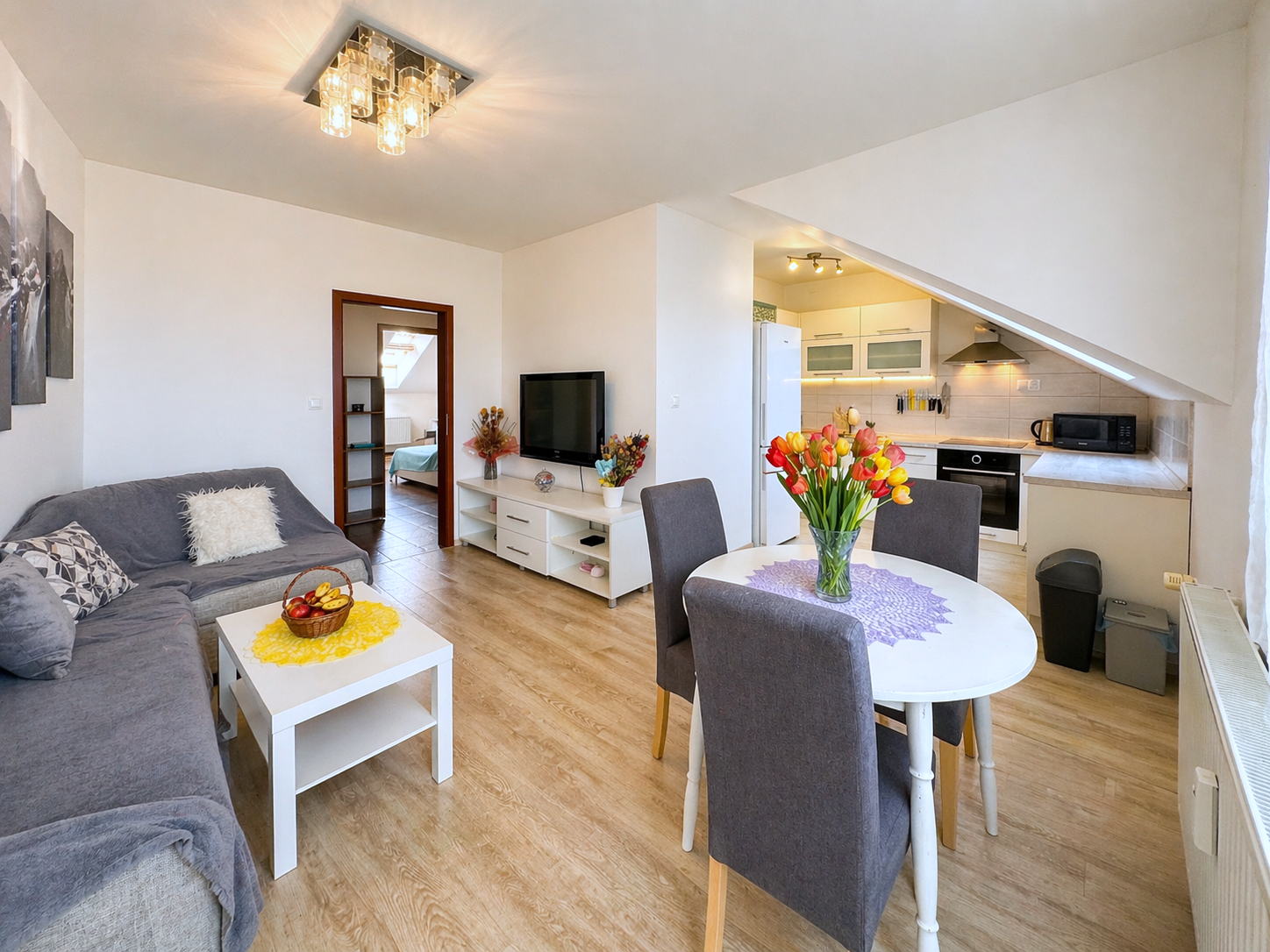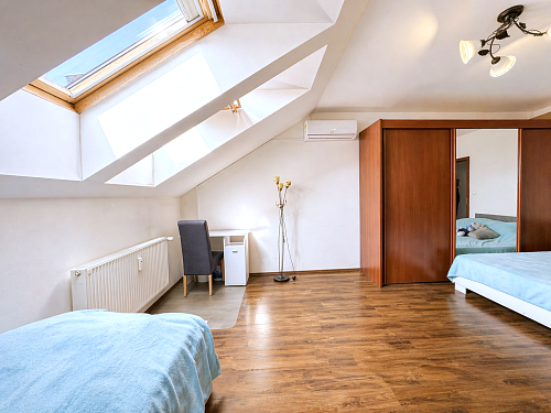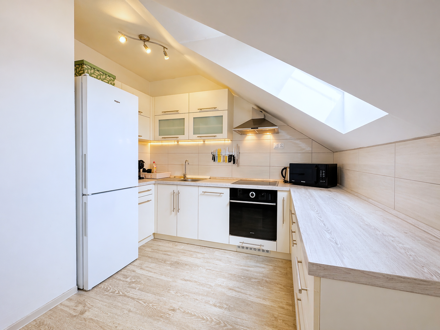 Byt je svetlý, vkusne zariadený a pripravený na okamžité nasťahovanie. Vďaka podkrovnému charakteru pôsobí veľmi útulne a zároveň prakticky – komfort zabezpečujú až dve klimatizačné jednotky s diaľkovým ovládaním.