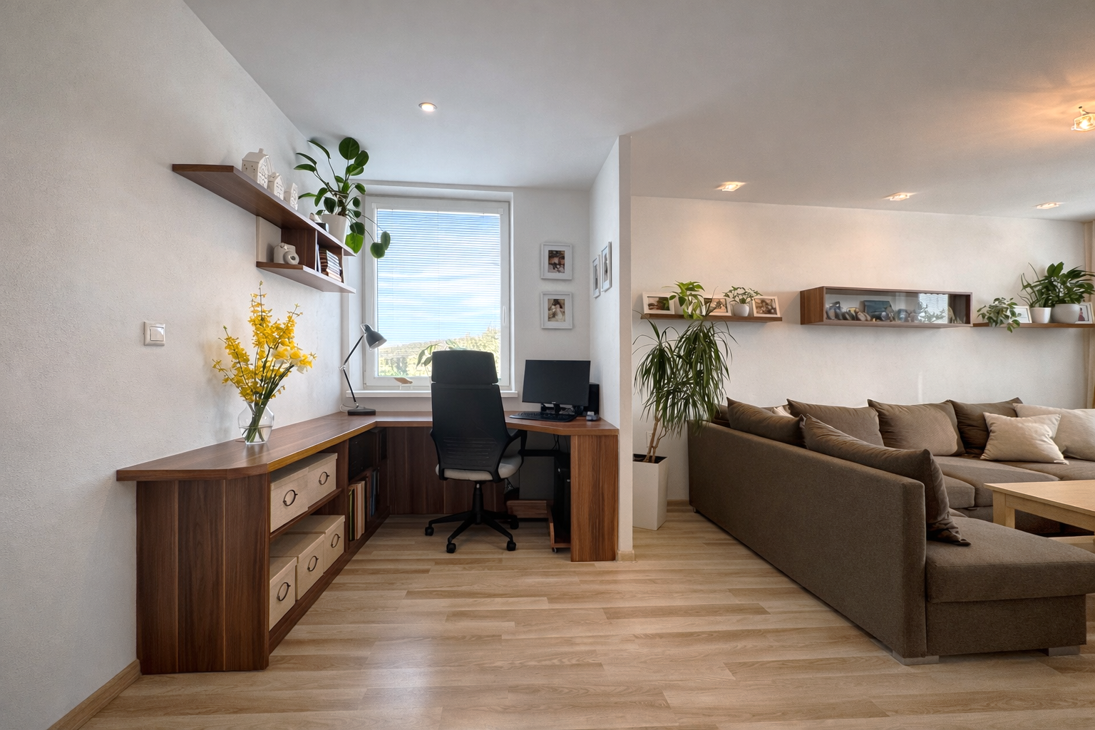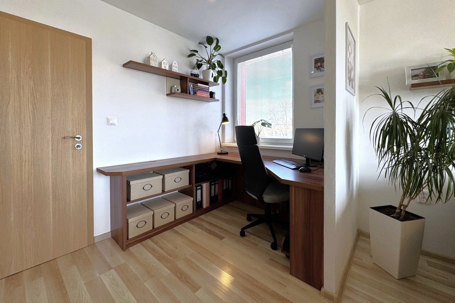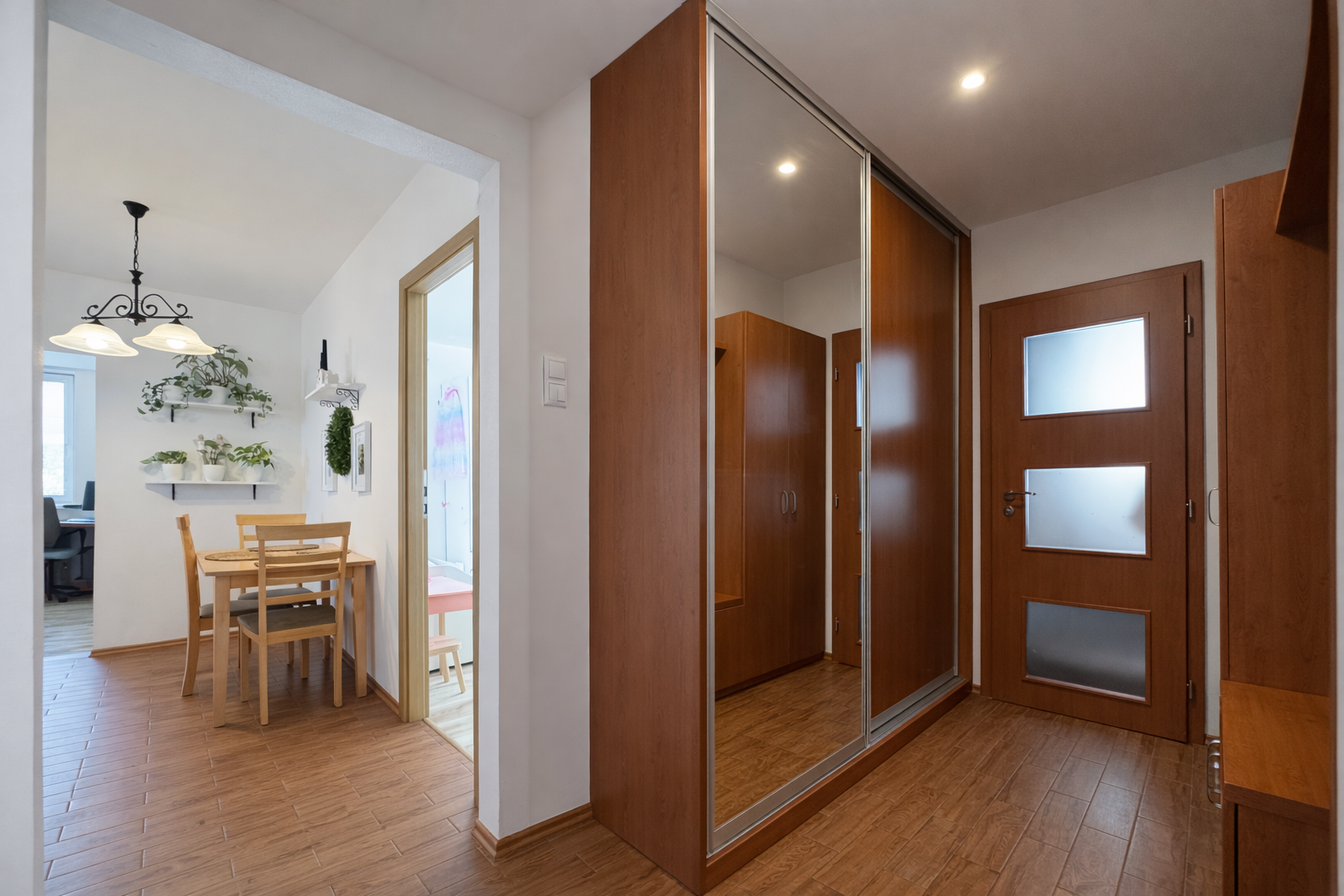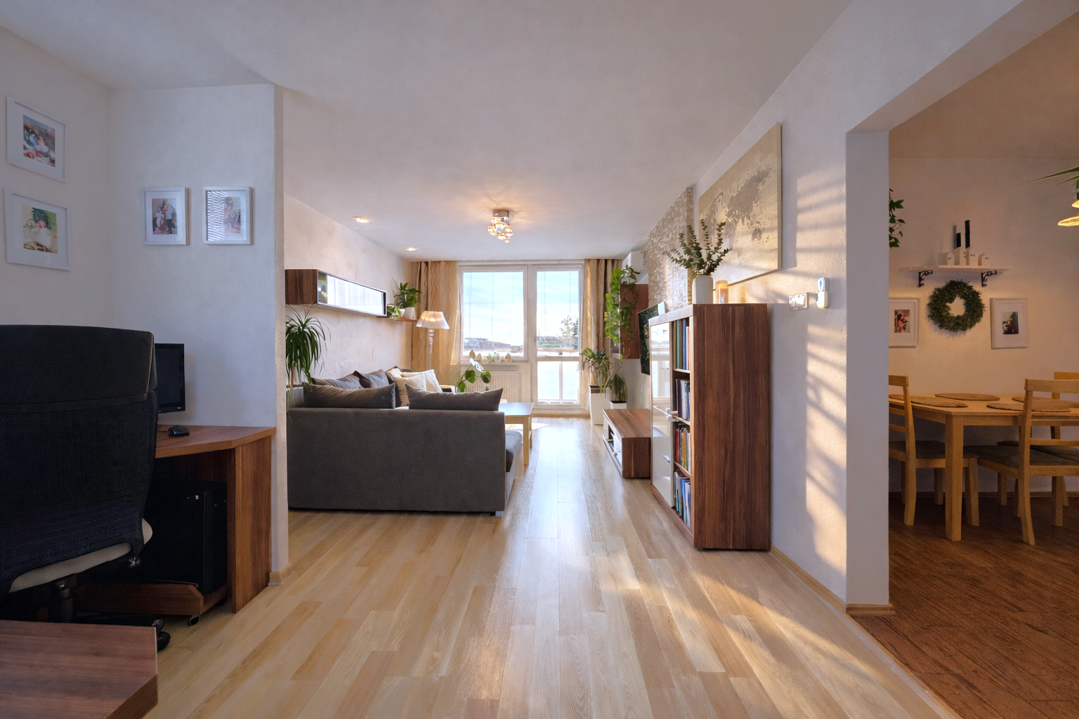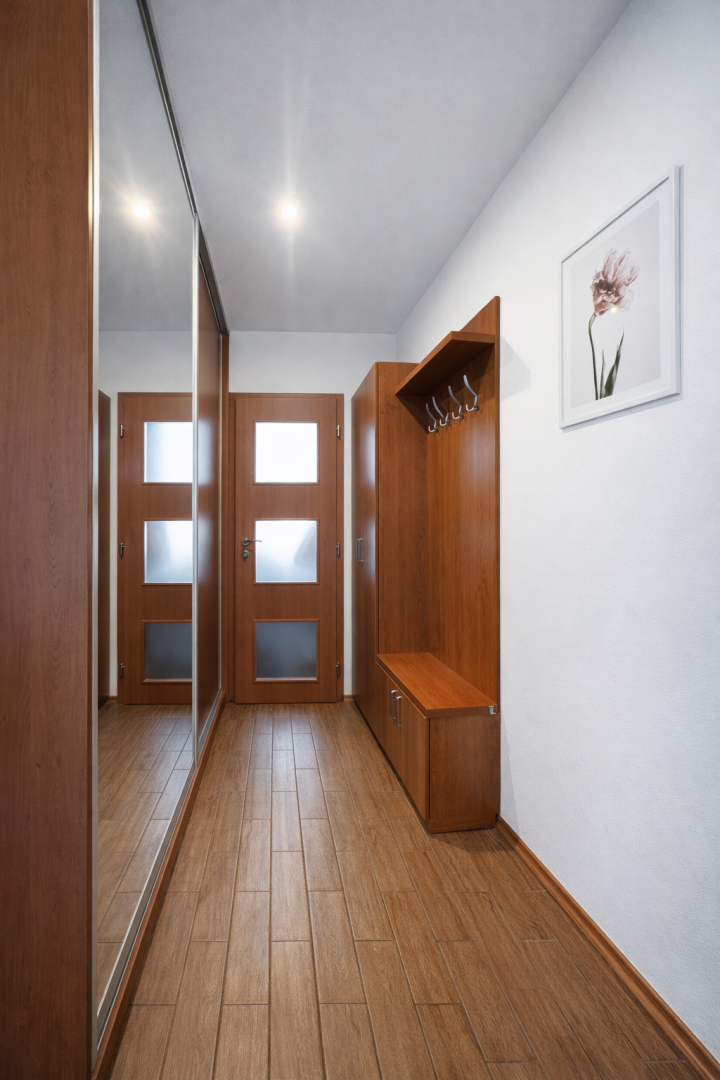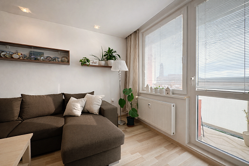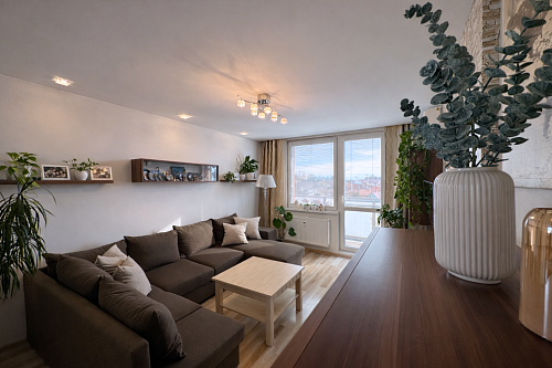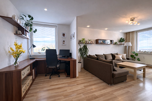 Dispozične byt pozostáva zo vstupnej chodby o výmere 5,61 m², z ktorej sa plynulo prechádza do jednotlivých miestností. Kuchyňa o výmere 8,12 m² je prepojená s jedálňou (8,37 m²), čím vzniká príjemný denný priestor. Dominantou bytu je obývacia izba s výmerou 23 m², v ktorej sa nachádza aj pracovný kút vytvorený na mieru, ideálny pre prácu z domu. Z obývačky je vstup na balkón o výmere 3,75 m² s výhľadom na centrum mesta.