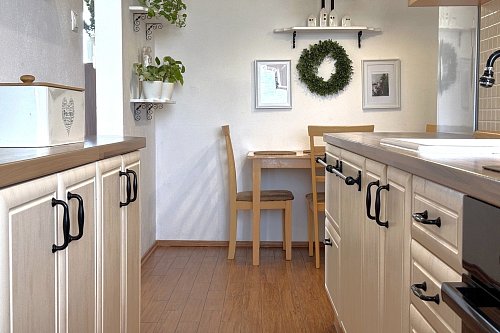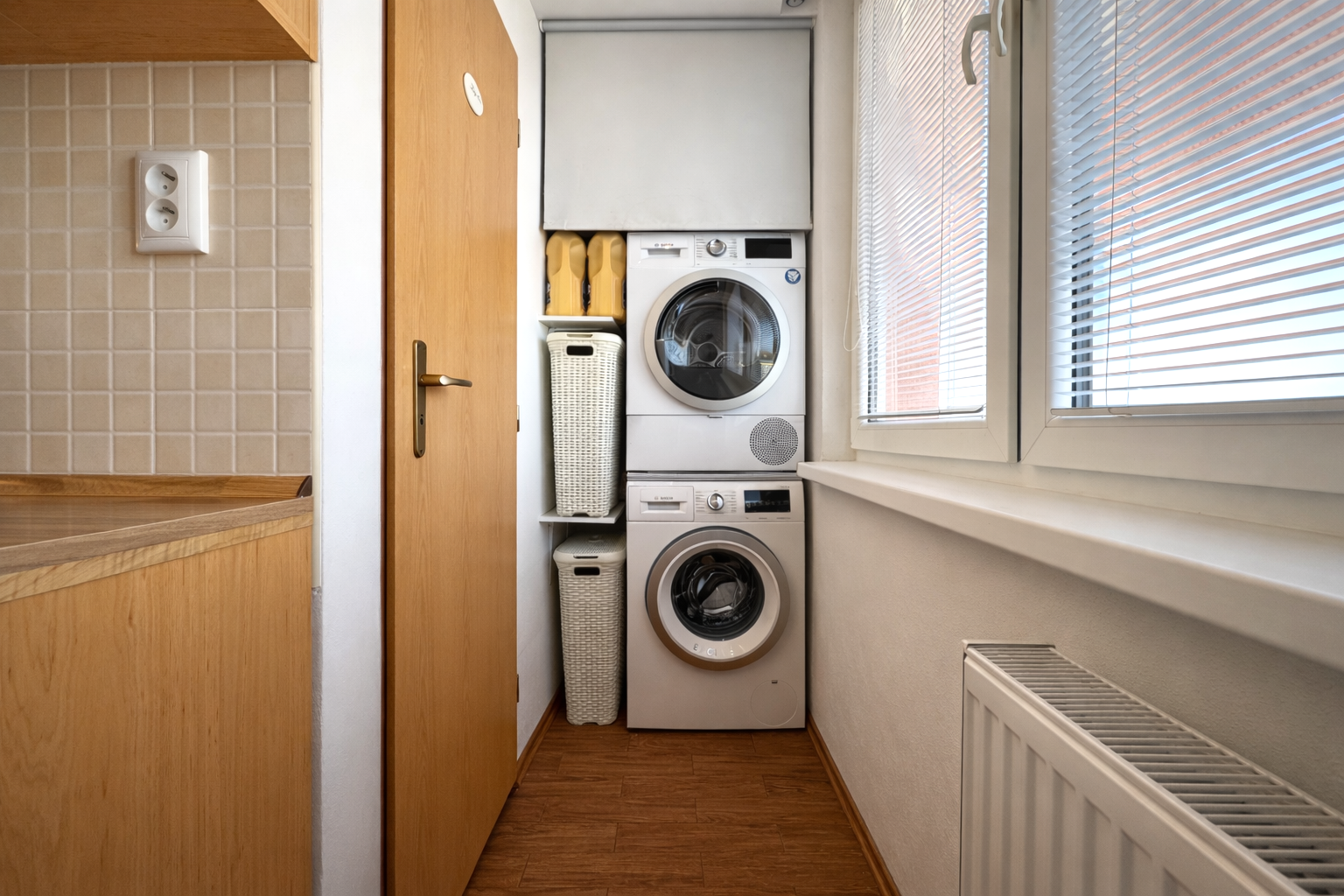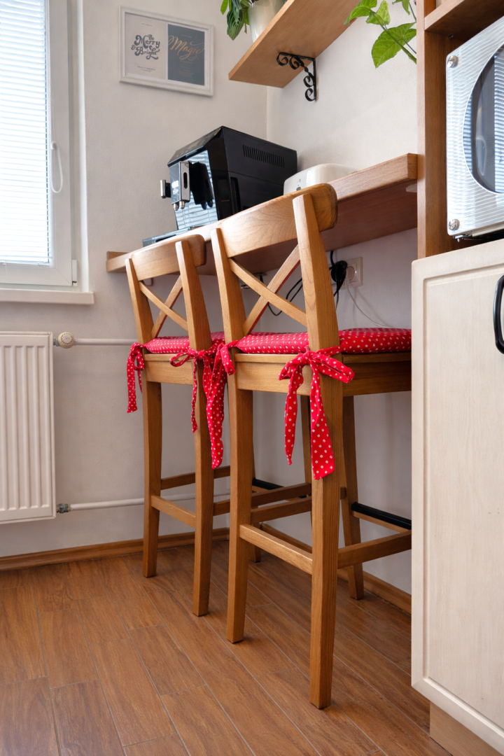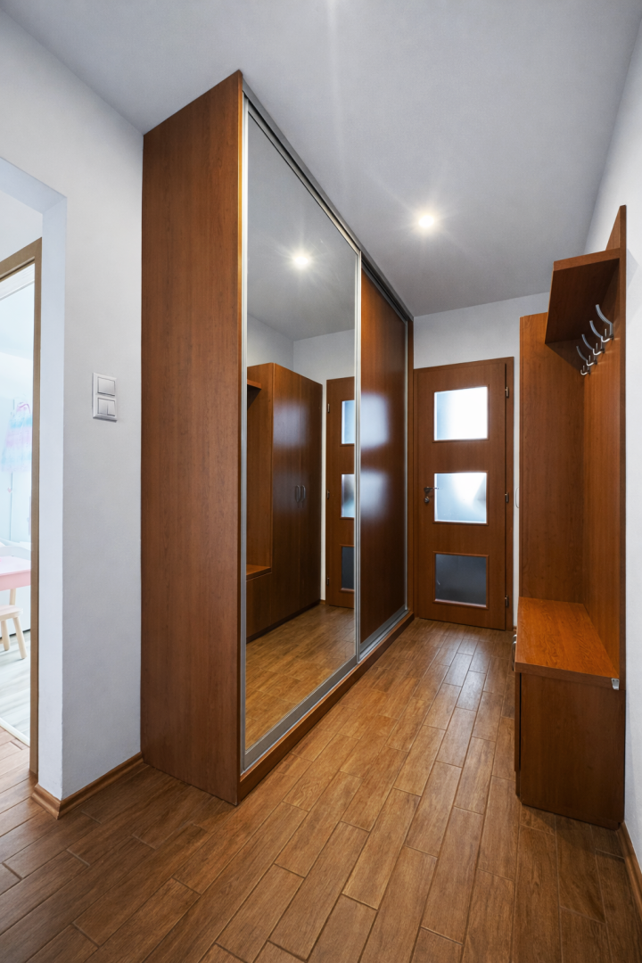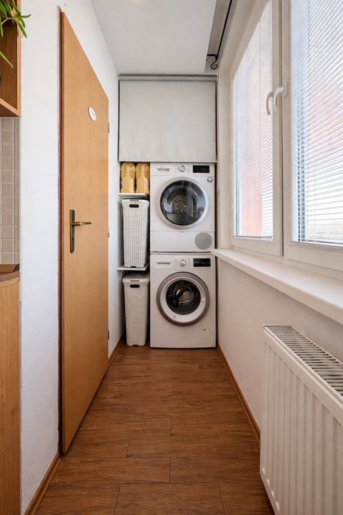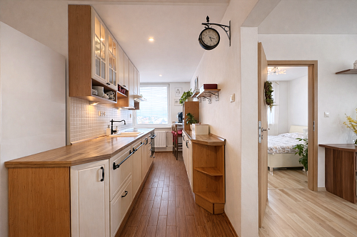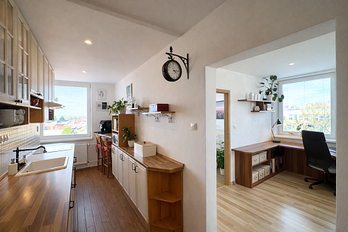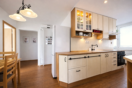 Kuchynská linka je vyrobená na mieru a vybavená vstavanými spotrebičmi – umývačka riadu, indukčná varná doska a elektrická rúra. V byte sa nachádzajú aj vstavané skrine na mieru v spálni a na chodbe a praktický nábytok v obývačke vrátane pracovného priestoru.