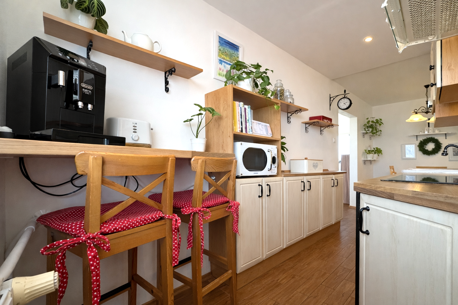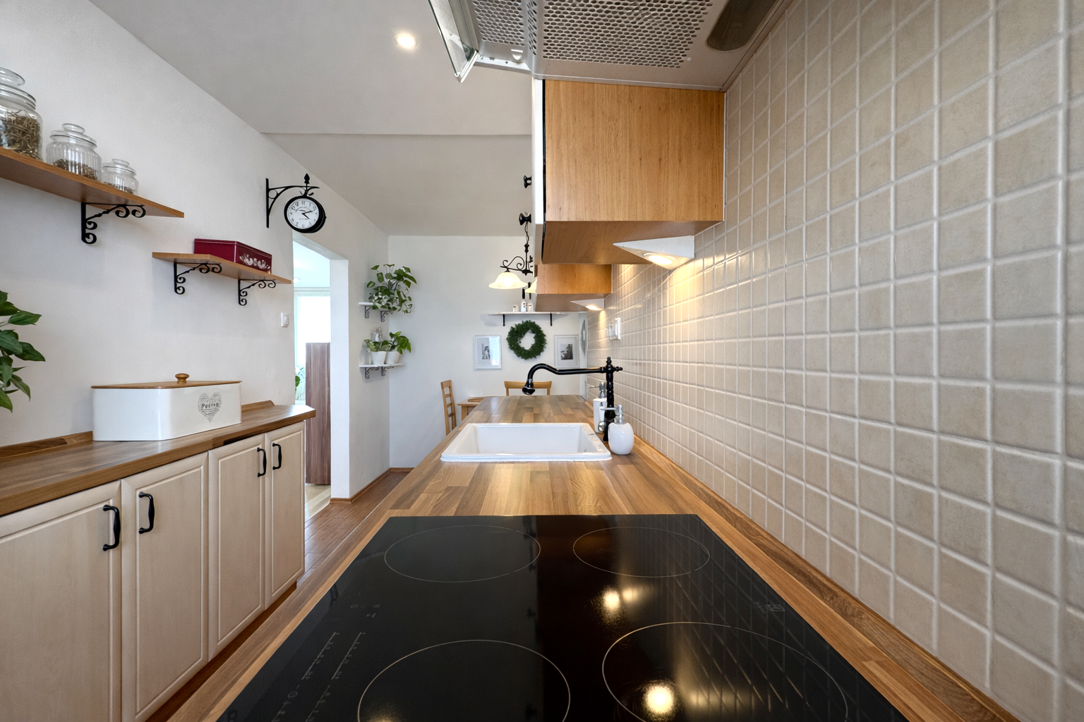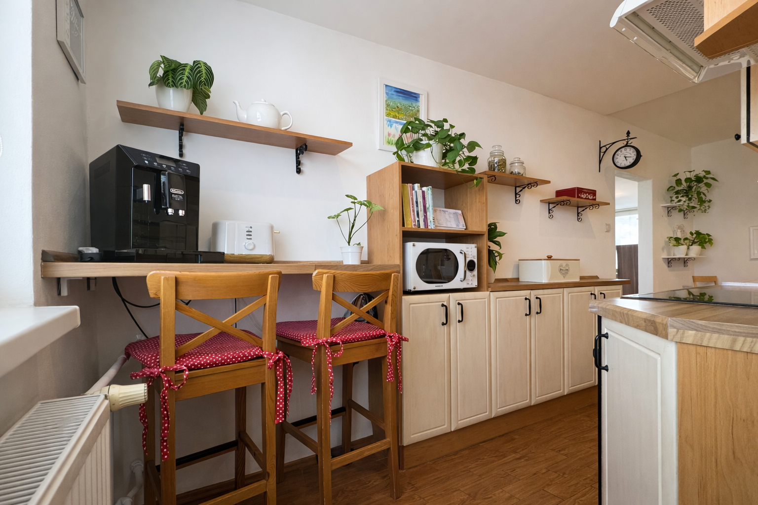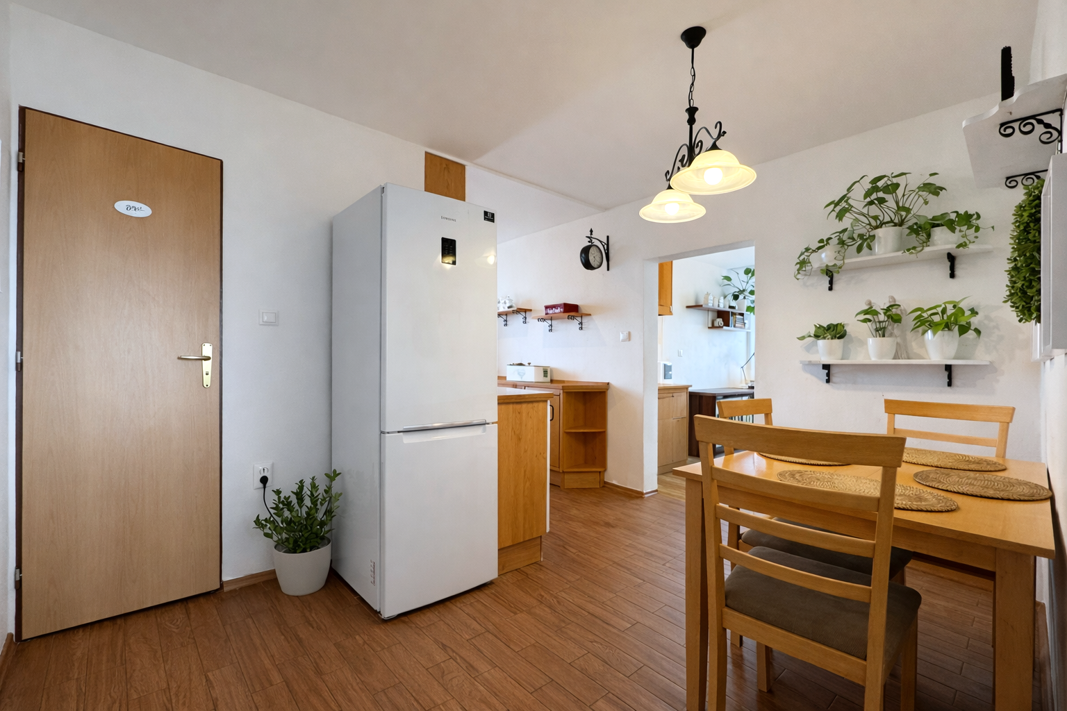 Kuchynská linka je vyrobená na mieru a vybavená vstavanými spotrebičmi – umývačka riadu, indukčná varná doska a elektrická rúra. V byte sa nachádzajú aj vstavané skrine na mieru v spálni a na chodbe a praktický nábytok v obývačke vrátane pracovného priestoru.