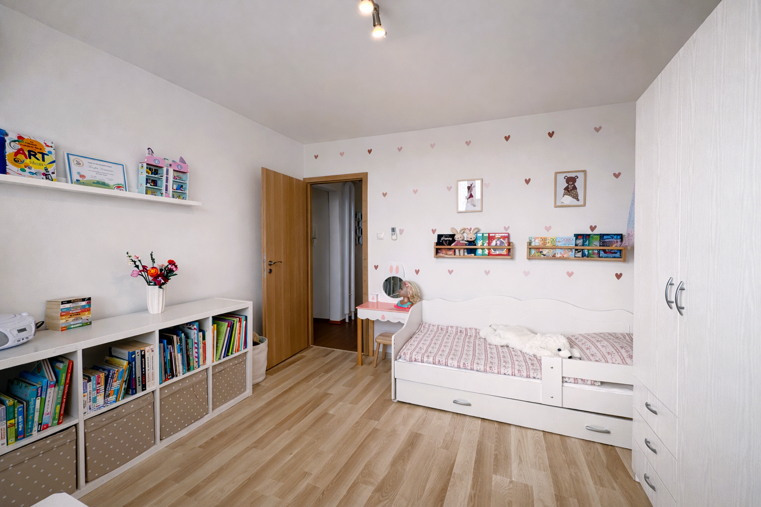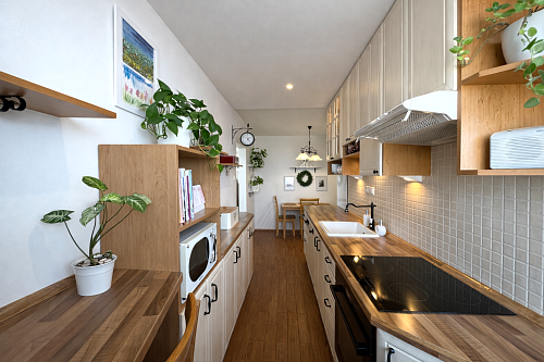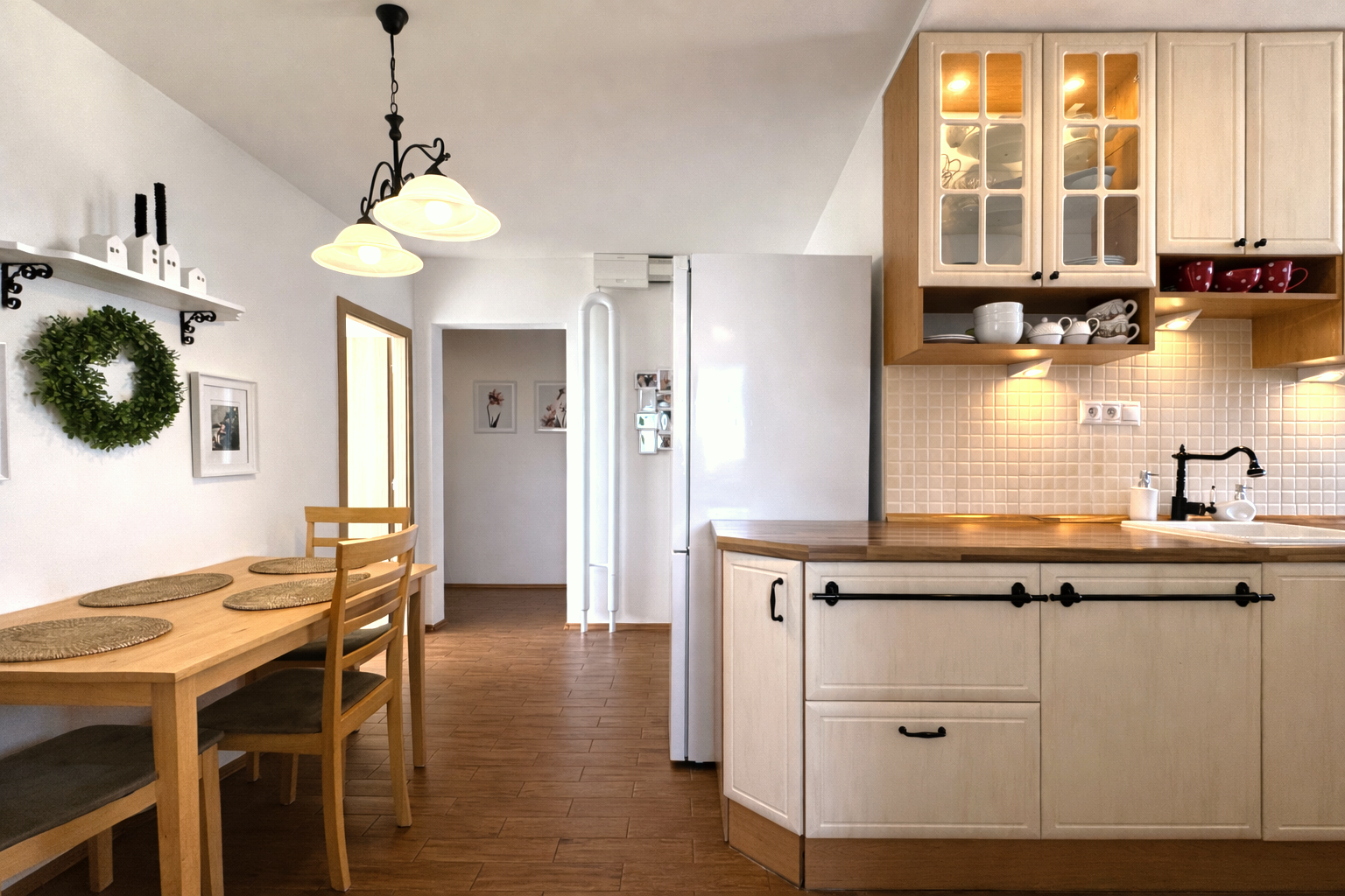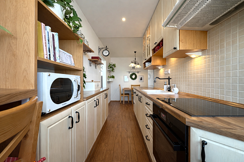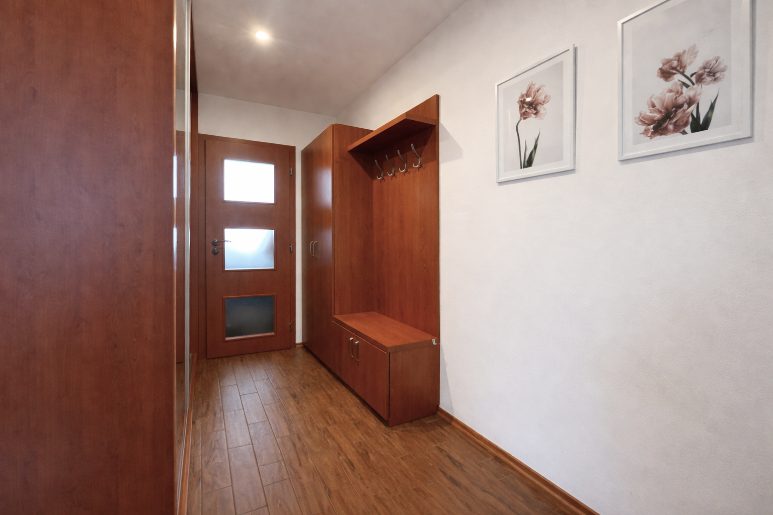 Kuchynská linka je vyrobená na mieru a vybavená vstavanými spotrebičmi – umývačka riadu, indukčná varná doska a elektrická rúra. V byte sa nachádzajú aj vstavané skrine na mieru v spálni a na chodbe a praktický nábytok v obývačke vrátane pracovného priestoru.